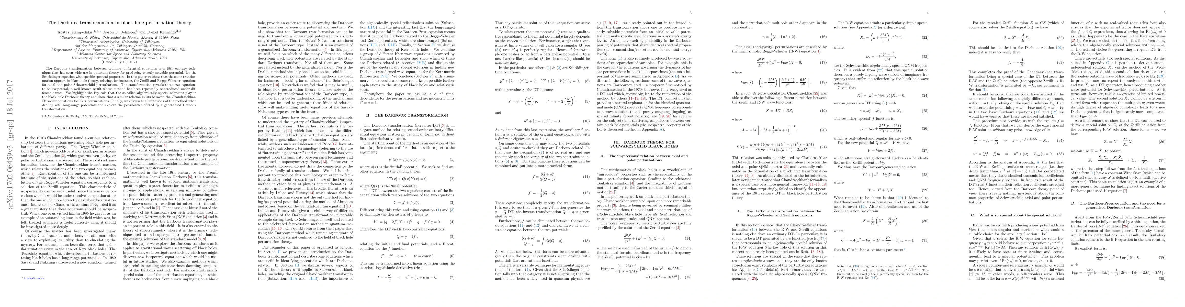 The Darboux transformation between ordinary differential equations is a 19th century technique that has seen wide use in quantum theory for producing exactly solvable potentials for the Schr\"odinger equation with specific spectral properties. In this paper we show that the same transformation appears in black hole theory, relating, for instance, the Zerilli and Regge-Wheeler equations for axial and polar Schwarzschild perturbations. The transformation reveals these two equations to be isospectral, a well known result whose method has been repeatedly reintroduced under different names. We highlight the key role that the so-called algebraically special solutions play in the black hole Darboux theory and show that a similar relation exists between the Chandrasekhar-Detweiler equations for Kerr perturbations. Finally, we discuss the limitations of the method when dealing with long-range potentials and explore the possibilities offered by a generalised Darboux transformation.