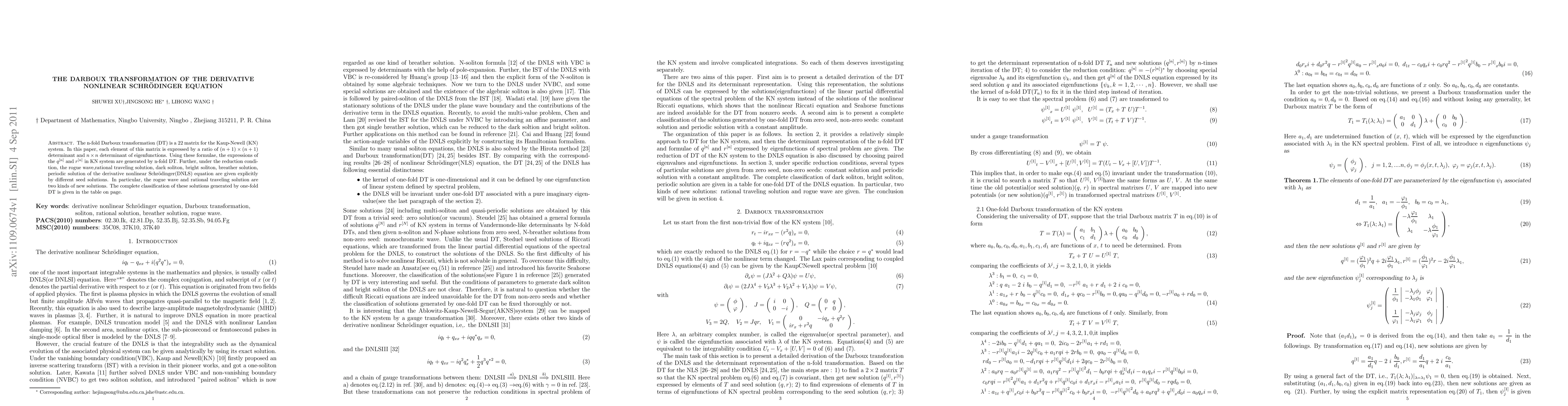 The n-fold Darboux transformation (DT) is a 2\times2 matrix for the Kaup-Newell (KN) system. In this paper,each element of this matrix is expressed by a ratio of $(n+1)\times (n+1)$ determinant and $n\times n$ determinant of eigenfunctions. Using these formulae, the expressions of the $q^{[n]}$ and $r^{[n]}$ in KN system are generated by n-fold DT. Further, under the reduction condition, the rogue wave,rational traveling solution, dark soliton, bright soliton, breather solution, periodic solution of the derivative nonlinear Schr\"odinger(DNLS) equation are given explicitly by different seed solutions. In particular, the rogue wave and rational traveling solution are two kinds of new solutions. The complete classification of these solutions generated by one-fold DT is given in the table on page.