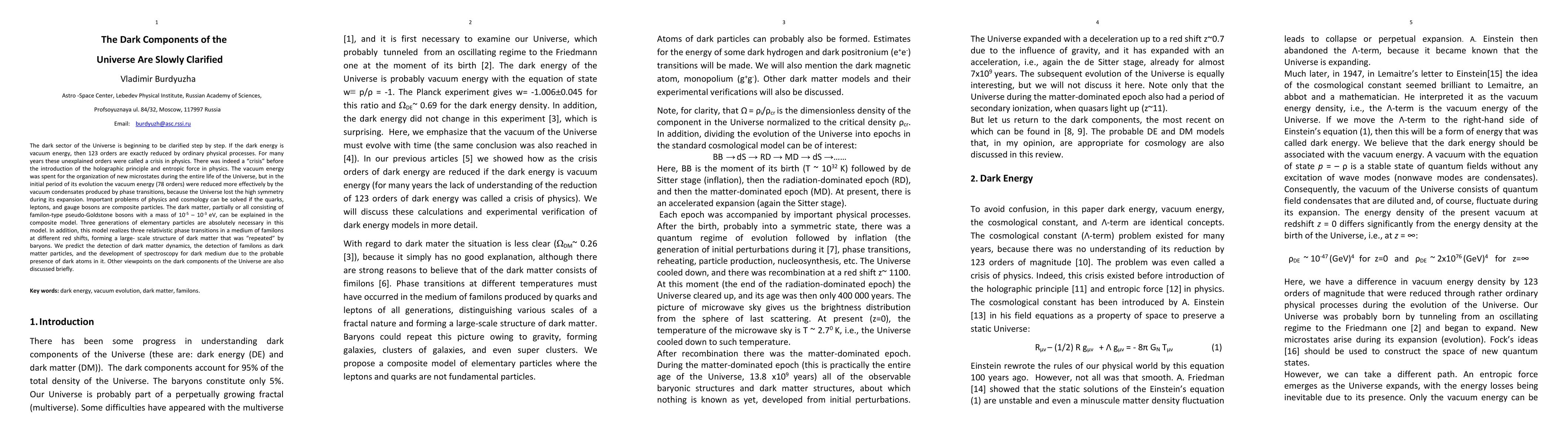 The dark sector of the Universe is beginning to be clarified step by step. If the dark energy is vacuum energy, then 123 orders are exactly reduced by ordinary physical processes. For many years these unexplained orders were called a crisis in physics. There was indeed a "crisis" before the introduction of the holographic principle and entropic force in physics. The vacuum energy was spent for the organization of new microstates during the entire life of the Universe, but in the initial period of its evolution the vacuum energy (78 orders) were reduced more effectively by the vacuum condensates produced by phase transitions, because the Universe lost the high symmetry during its expansion. Important problems of physics and cosmology can be solved if the quarks, leptons, and gauge bosons are composite particles. The dark matter, partially or all consisting of familon-type pseudo-Goldstone bosons with a mass of 10^{-5} - 10^{-3} eV, can be explained in the composite model. Three generations of elementary particles are absolutely necessary in this model. In addition, this model realizes three relativistic phase transitions in a medium of familons at different red shifts, forming a large-scale structure of dark matter that was "repeated" by baryons. We predict the detection of dark matter dynamics, the detection of familons as dark matter particles, and the development of spectroscopy for dark medium due to the probable presence of dark atoms in it. Other viewpoints on the dark components of the Universe are also discussed briefly.