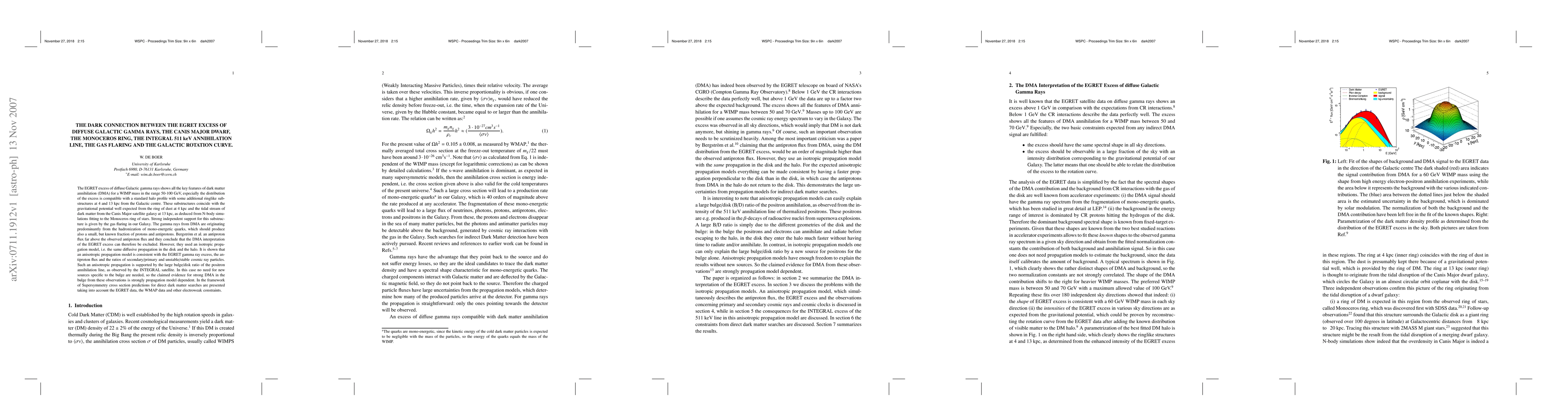 This paper explores the EGRET excess of diffuse Galactic gamma rays, suggesting it aligns with dark matter annihilation, particularly from WIMPs in the 50-100 GeV range. The gamma ray distribution matches a standard halo profile with additional ringlike substructures linked to the Canis Major dwarf and the Monoceros ring. An anisotropic propagation model resolves discrepancies with antiproton flux predictions, supporting the dark matter interpretation without requiring new sources.