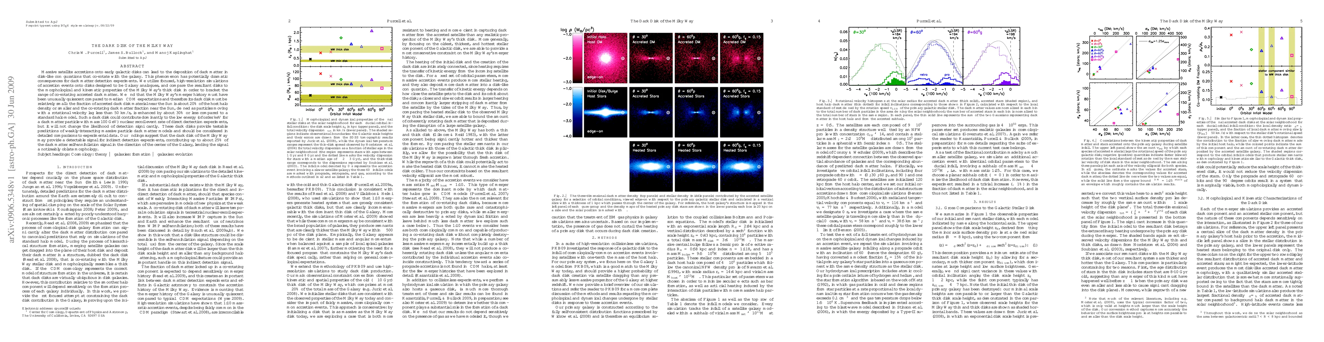 The paper presents advanced simulation techniques to model dark disk formation through satellite accretion events and compares the results with the Milky Way's thick disk properties.