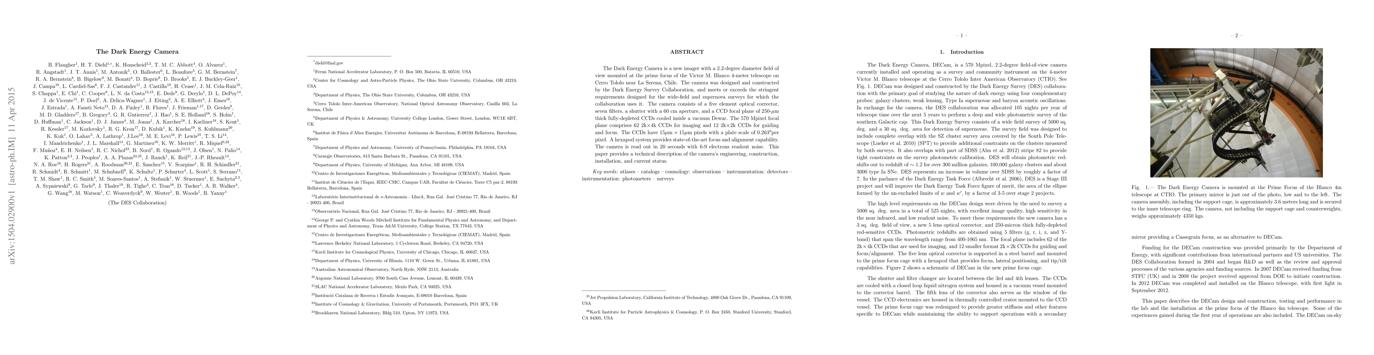 The Dark Energy Camera, mounted on the Victor M. Blanco 4-meter telescope, is a sophisticated imager designed for wide-field and supernova surveys, featuring a 570 Mpixel focal plane with 62 imaging CCDs and a hexapod system for precise focus and alignment. The camera's construction and installation details are thoroughly described.