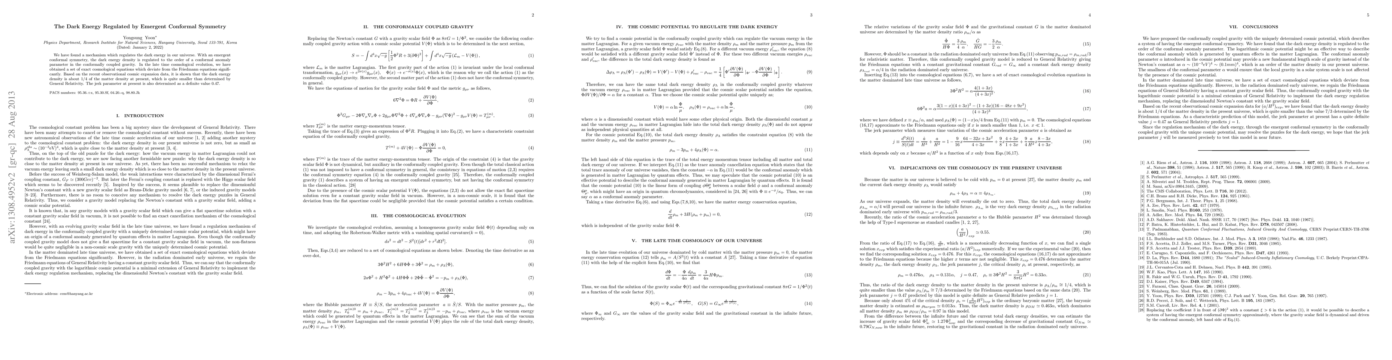 We have found a mechanism which regulates the dark energy in our universe. With an emergent conformal symmetry, the dark energy density is regulated to the order of a conformal anomaly parameter in the conformally coupled gravity. In the late time cosmological evolution, we have obtained a set of exact cosmological equations which deviate from the Friedmann equations significantly. Based on the recent observational cosmic expansion data, it is shown that the dark energy density is about 1/4 of the matter density at present, which is quite smaller than determined by General Relativity. The jerk parameter at present is also determined as a definite value 0.47.