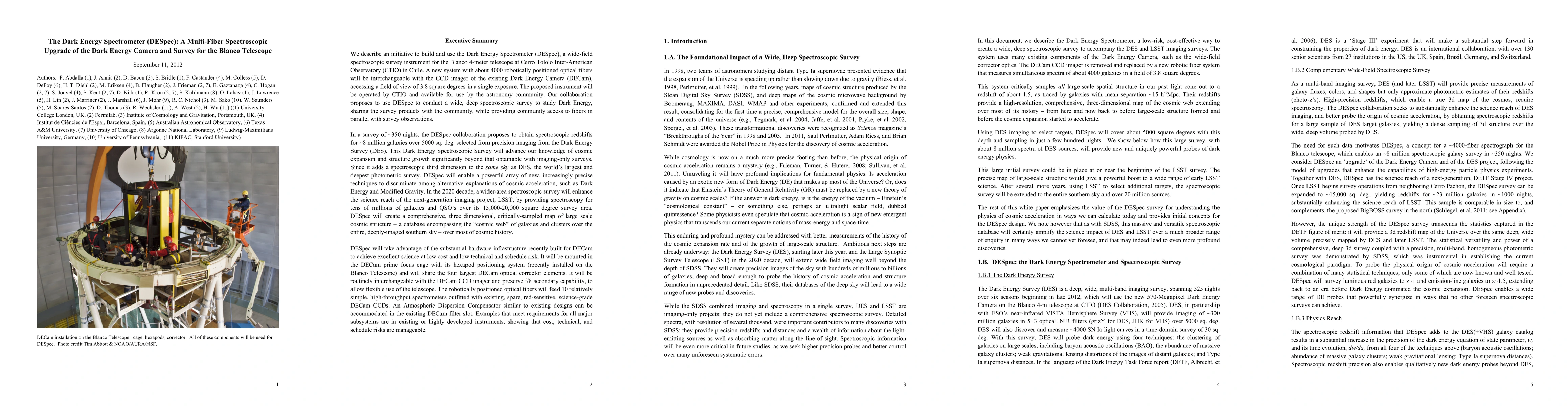 The Dark Energy Spectrometer (DESpec) is a new spectroscopic survey instrument for the Blanco Telescope, featuring 4000 robotically positioned fibers to obtain redshifts for 8 million galaxies over 5000 square degrees, enhancing our understanding of cosmic expansion and discrimination between Dark Energy and Modified Gravity.