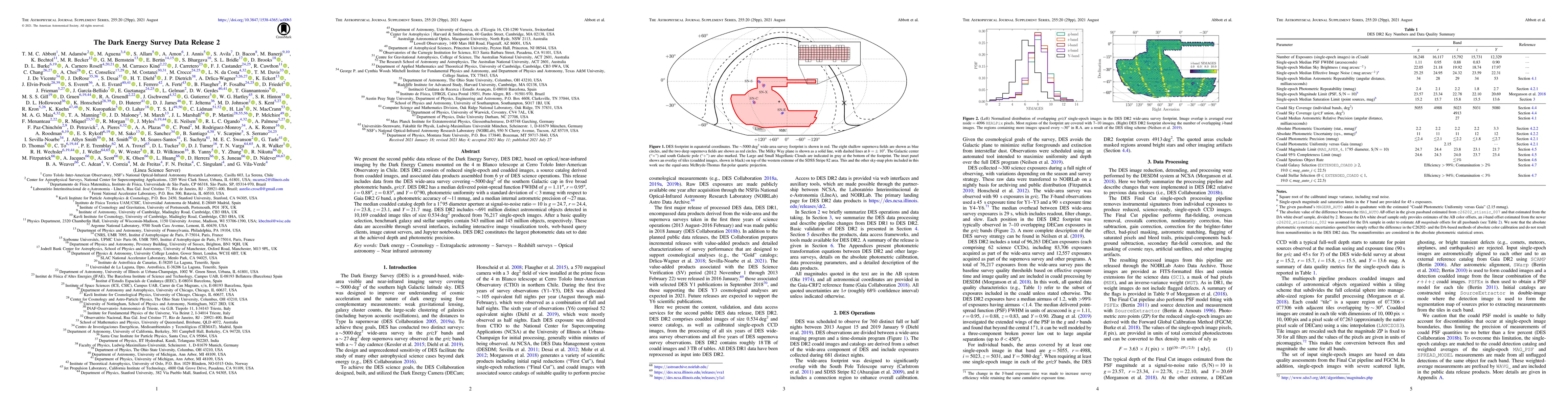 The Dark Energy Survey Data Release 2 (DES DR2) presents a comprehensive dataset from 6 years of observations, featuring ~691 million astronomical objects across ~5000 deg² of the southern sky in five photometric bands. The data includes high-precision imaging and a catalog with notable depth and accuracy.