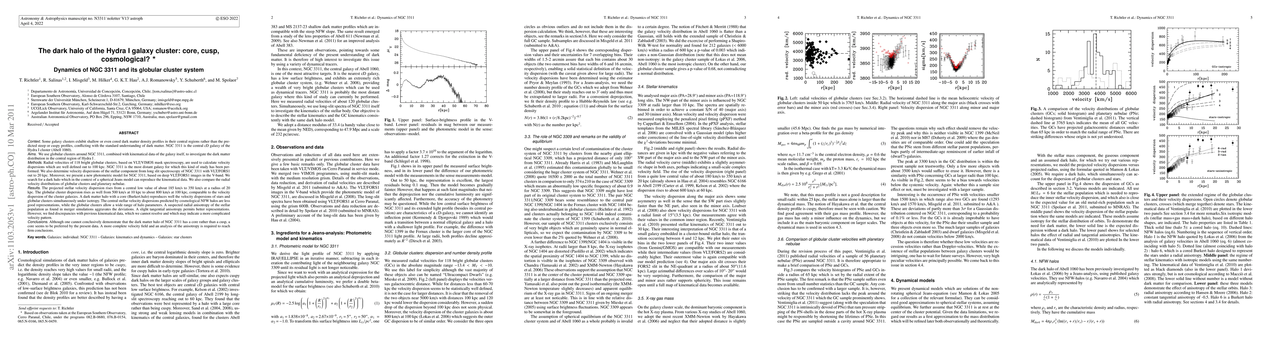The paper presents a detailed dynamical analysis of the Hydra I galaxy cluster, focusing on the central cD galaxy NGC 3311, and compares different dark matter halo models (NFW and cored) to the observed kinematic data of stars and globular clusters.