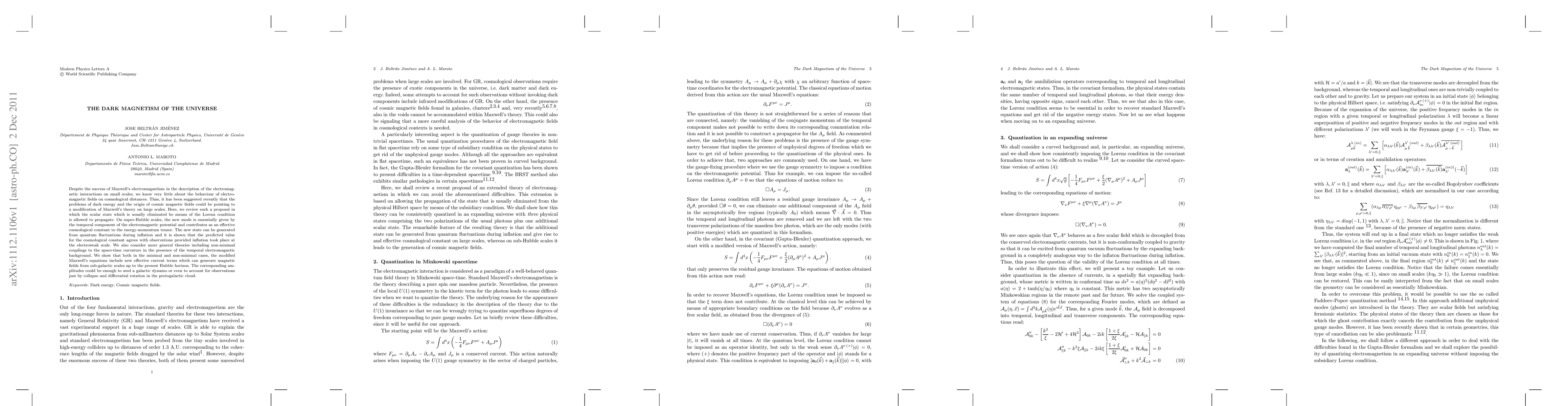Despite the success of Maxwell's electromagnetism in the description of the electromagnetic interactions on small scales, we know very little about the behaviour of electromagnetic fields on cosmological distances. Thus, it has been suggested recently that the problems of dark energy and the origin of cosmic magnetic fields could be pointing to a modification of Maxwell's theory on large scales. Here, we review such a proposal in which the scalar state which is usually eliminated be means of the Lorenz condition is allowed to propagate. On super-Hubble scales, the new mode is essentially given by the temporal component of the electromagnetic potential and contributes as an effective cosmological constant to the energy-momentum tensor. The new state can be generated from quantum fluctuations during inflation and it is shown that the predicted value for the cosmological constant agrees with observations provided inflation took place at the electroweak scale. We also consider more general theories including non-minimal couplings to the space-time curvature in the presence of the temporal electromagnetic background. We show that both in the minimal and non-minimal cases, the modified Maxwell's equations include new effective current terms which can generate magnetic fields from sub-galactic scales up to the present Hubble horizon. The corresponding amplitudes could be enough to seed a galactic dynamo or even to account for observations just by collapse and differential rotation in the protogalactic cloud.