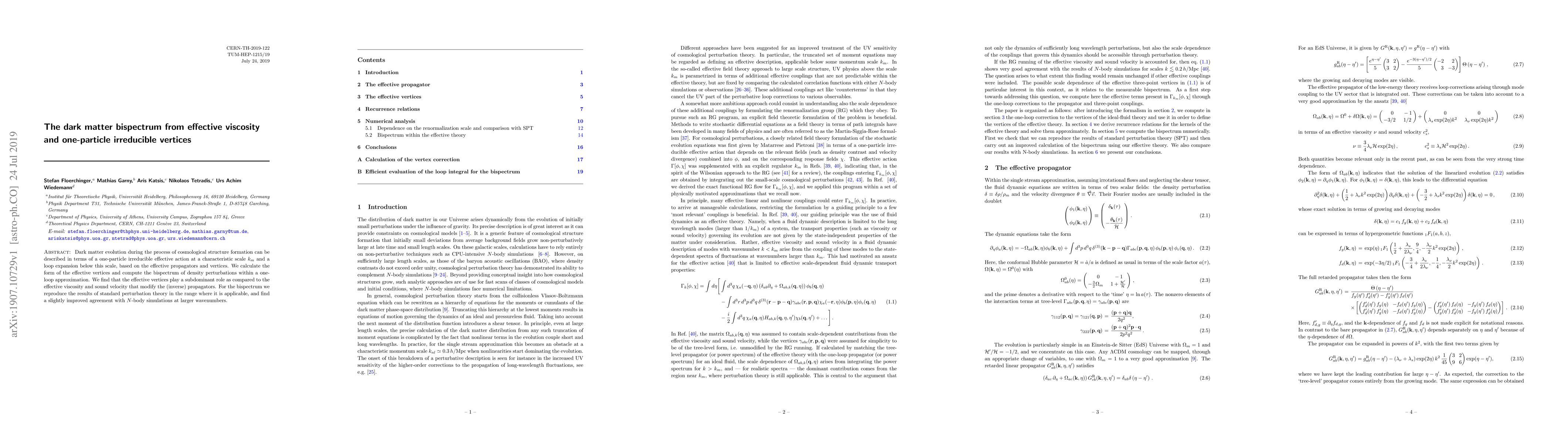 Dark matter evolution during the process of cosmological structure formation can be described in terms of a one-particle irreducible effective action at a characteristic scale $k_m$ and a loop expansion below this scale, based on the effective propagators and vertices. We calculate the form of the effective vertices and compute the bispectrum of density perturbations within a one-loop approximation. We find that the effective vertices play a subdominant role as compared to the effective viscosity and sound velocity that modify the (inverse) propagators. For the bispectrum we reproduce the results of standard perturbation theory in the range where it is applicable, and find a slightly improved agreement with N-body simulations at larger wavenumbers.