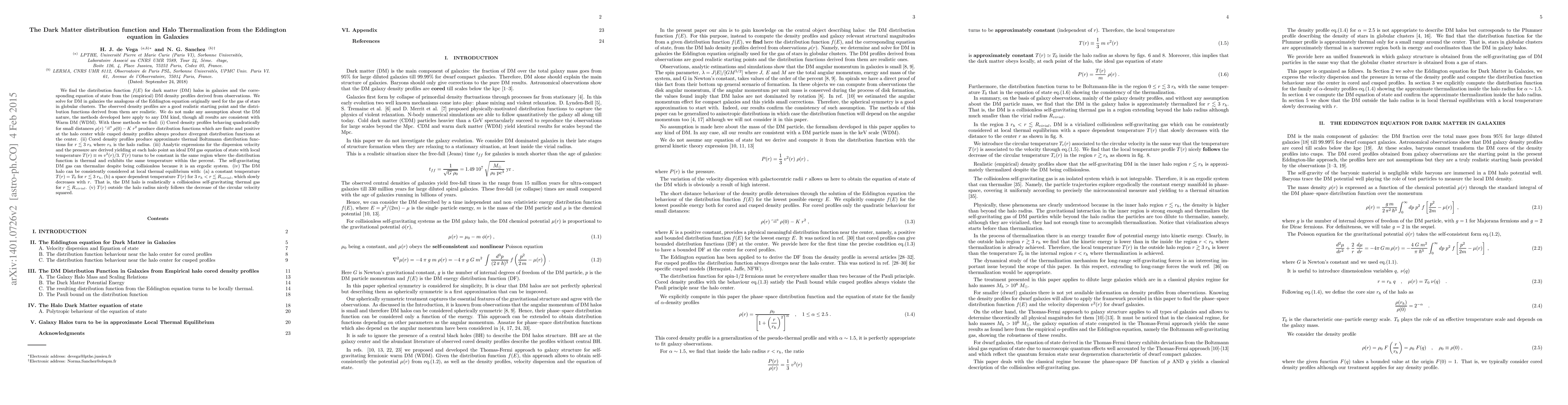 We find the distribution function f(E) for dark matter (DM) halos in galaxies and the corresponding equation of state from the (empirical) DM density profiles derived from observations. We solve for DM in galaxies the analogous of the Eddington equation originally used for the gas of stars in globular clusters. The observed density profiles are a good realistic starting point and the distribution functions derived from them are realistic. We do not make any assumption about the DM nature, the methods developed here apply to any DM kind, though all results are consistent with Warm DM. With these methods we find: (i) Cored density profiles behaving quadratically for small distances rho(r) r -> 0 = rho(0) - K r^2 produce distribution functions which are finite and positive at the halo center while cusped density profiles always produce divergent distribution functions at the center. (ii) Cored density profiles produce approximate thermal Boltzmann distribution functions for r < 3 r_h where r_h is the halo radius. (iii) Analytic expressions for the dispersion velocity and the pressure are derived yielding an ideal DM gas equation of state with local temperature T(r) = m v^2(r)/3. T(r) turns to be constant in the same region where the distribution function is thermal and exhibits the same temperature within the percent. The self-gravitating DM gas can thermalize despite being collisionless because it is an ergodic system. (iv) The DM halo can be consistently considered at local thermal equilibrium with: (a) a constant temperature T(r) = T_0 for r < 3 \; r_h, (b) a space dependent temperature T(r) for 3 r_h < r < R_{virial}, which slowly decreases with r. That is, the DM halo is realistically a collisionless self-gravitating thermal gas for r < R_{virial}. (v) T(r) outside the halo radius nicely follows the decrease of the circular velocity squared.