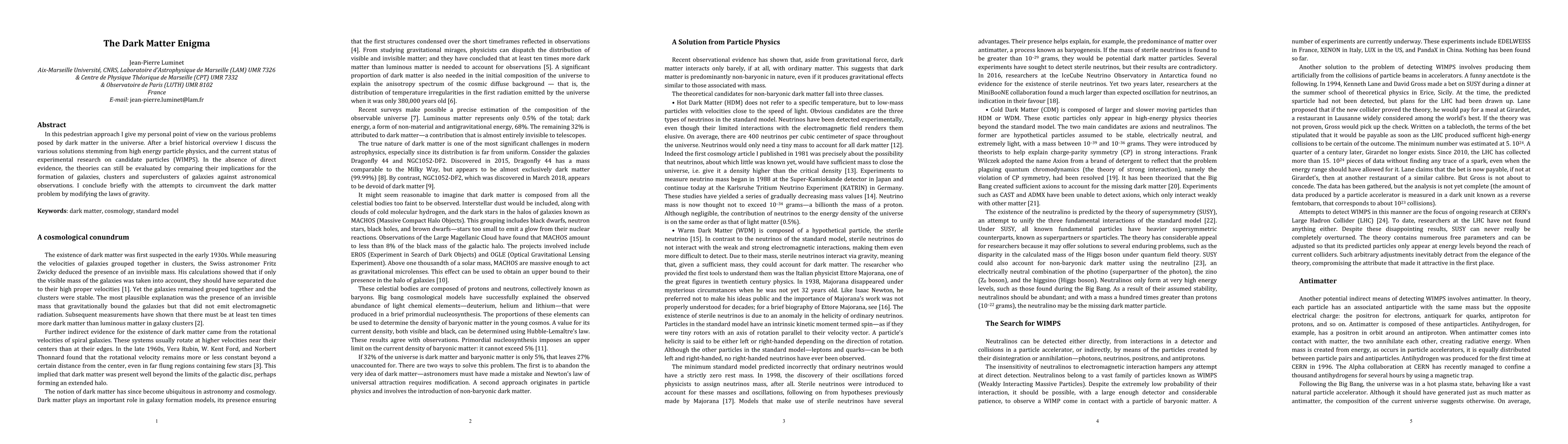 In this pedestrian approach I give my personal point of view on the various problems posed by dark matter in the universe. After a brief historical overview I discuss the various solutions stemming from high energy particle physics, and the current status of experimental research on candidate particles (WIMPS). In the absence of direct evidence, the theories can still be evaluated by comparing their implications for the formation of galaxies, clusters and superclusters of galaxies against astronomical observations. I conclude briefly with the attempts to circumvent the dark matter problem by modifying the laws of gravity.