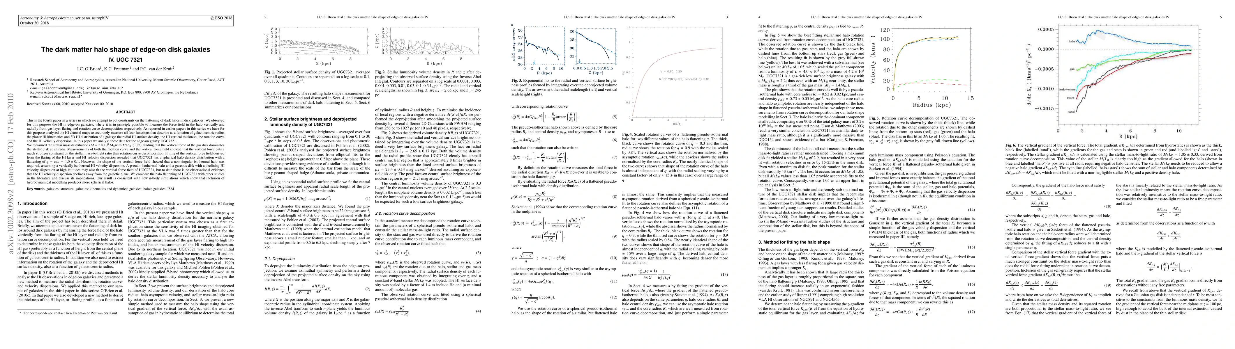 This is the fourth paper in a series in which we attempt to put constraints on the flattening of dark halos in disk galaxies. We observed for this purpose the HI in edge-on galaxies, where it is in principle possible to measure the force field in the halo vertically and radially from gas layer flaring and rotation curve decomposition respectively. We have analysed the HI channel maps to accurately measure all four functions that describe the HI kinematics and 3D distribution: the radial HI surface density, the HI vertical thickness, the rotation curve and the HI velocity dispersion. In this paper we analyse these data for the edge-on galaxy UGC7321. We measured the stellar mass distribution ($M=3\times10^8$ \msun with $M/L_R\lesim0.2$), finding that the vertical force of the gas disk dominates the stellar disk at all radii. We find that the vertical force puts a much stronger constraint on the stellar mass-to-light ratio than rotation curve decomposition. Fitting of the vertical force field derived from the flaring and velocity dispersion of the HI revealed that UGC7321 has a spherical halo density distribution with a flattening of $q = c/a = 1.0 \pm 0.1$.