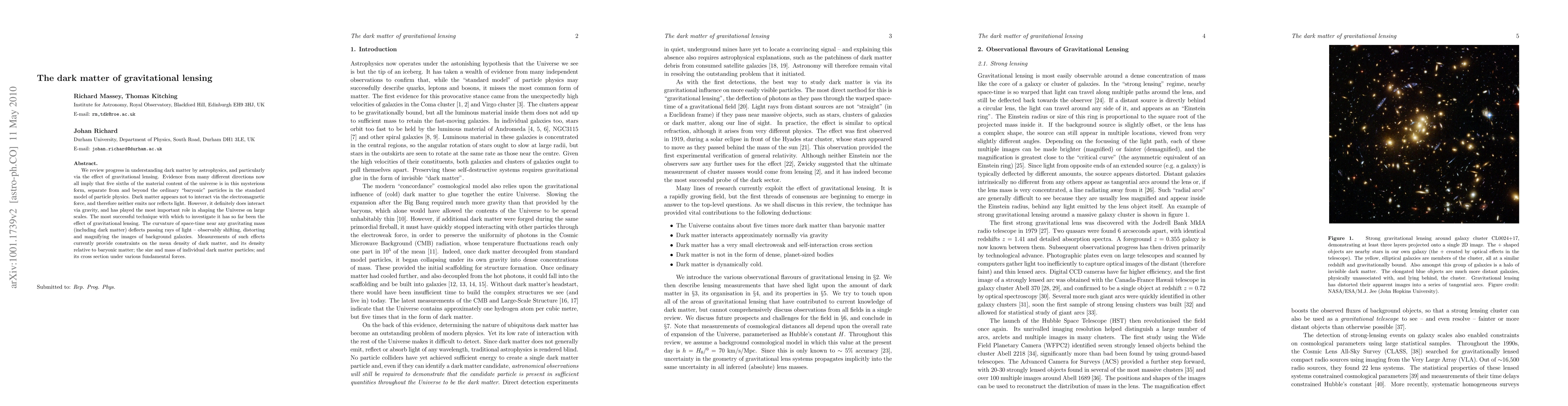 We review progress in understanding dark matter by astrophysics, and particularly via the effect of gravitational lensing. Evidence from many different directions now all imply that five sixths of the material content of the universe is in this mysterious form, separate from and beyond the ordinary "baryonic" particles in the standard model of particle physics. Dark matter appears not to interact via the electromagnetic force, and therefore neither emits nor reflects light. However, it definitely does interact via gravity, and has played the most important role in shaping the Universe on large scales. The most successful technique with which to investigate it has so far been the effect of gravitational lensing. The curvature of space-time near any gravitating mass (including dark matter) deflects passing rays of light - observably shifting, distorting and magnifying the images of background galaxies. Measurements of such effects currently provide constraints on the mean density of dark matter, and its density relative to baryonic matter; the size and mass of individual dark matter particles; and its cross section under various fundamental forces.