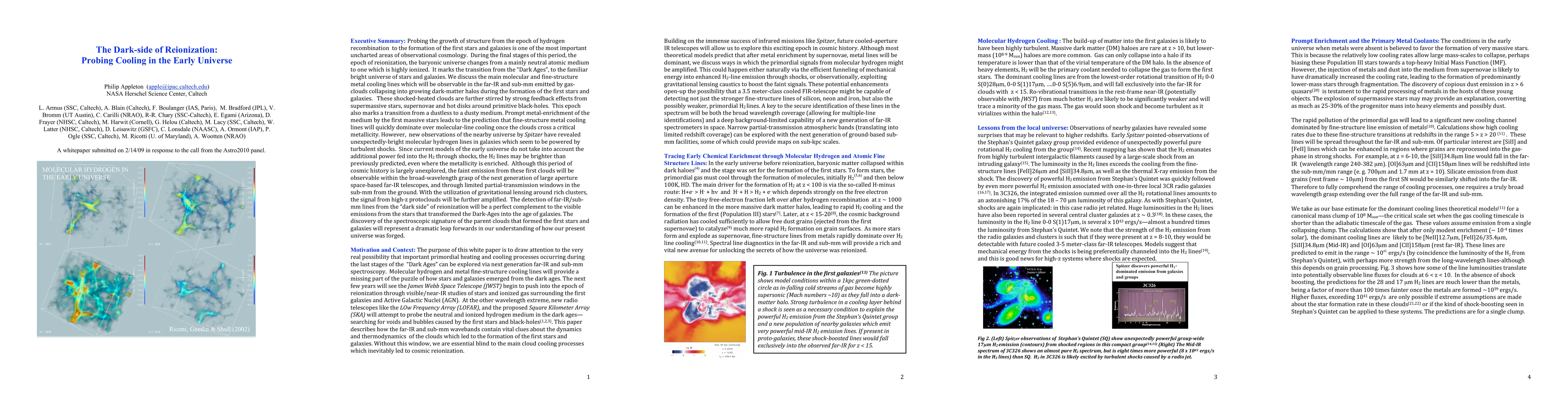 Probing the growth of structure from the epoch of hydrogen recombination to the formation of the first stars and galaxies is one of the most important uncharted areas of observational cosmology. Far-IR spectroscopy covering $\lambda$ 100-500 microns from space, and narrow partial transmission atmospheric bands available from the ground, opens up the possibility of probing the molecular hydrogen and metal fine-structure lines from primordial clouds from which the first stars and galaxies formed at 6 < z $<$ 15. Building on Spitzer observations of unexpectedly powerful H2 emission from shocks, we argue that next-generation far-IR space telescopes may open a new window into the main cloud cooling processes and feedback effects which characterized this vital, but unexplored epoch. Without this window, we are essential blind to the dominant cloud cooling which inevitably led to star formation and cosmic reionization.