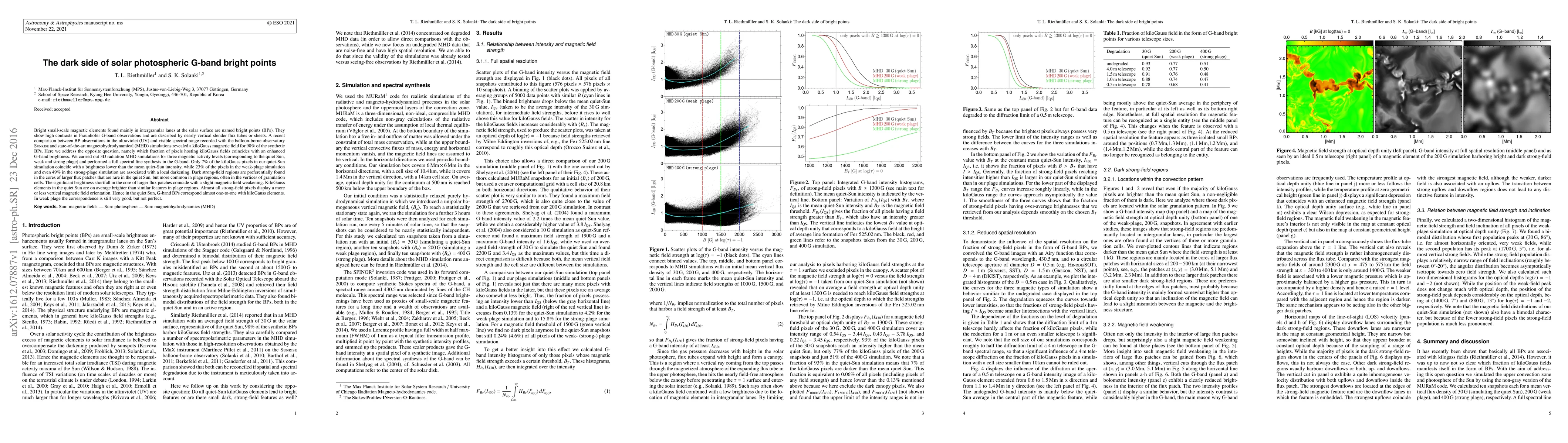 Bright small-scale magnetic elements found mainly in intergranular lanes at the solar surface are named bright points (BPs). They show high contrasts in Fraunhofer G-band observations and are described by nearly vertical slender flux tubes or sheets. A recent comparison between BP observations in the ultraviolet (UV) and visible spectral range recorded with the balloon-borne observatory SUNRISE and state-of-the-art magnetohydrodynamical (MHD) simulations revealed a kiloGauss magnetic field for 98% of the synthetic BPs. Here we address the opposite question, namely which fraction of pixels hosting kiloGauss fields coincides with an enhanced G-band brightness. We carried out 3D radiation MHD simulations for three magnetic activity levels (corresponding to the quiet Sun, weak and strong plage) and performed a full spectral line synthesis in the G-band. Only 7% of the kiloGauss pixels in our quiet-Sun simulation coincide with a brightness lower than the mean quiet-Sun intensity, while 23% of the pixels in the weak-plage simulation and even 49% in the strong-plage simulation are associated with a local darkening. Dark strong-field regions are preferentially found in the cores of larger flux patches that are rare in the quiet Sun, but more common in plage regions, often in the vertices of granulation cells. The significant brightness shortfall in the core of larger flux patches coincide with a slight magnetic field weakening. KiloGauss elements in the quiet Sun are on average brighter than similar features in plage regions. Almost all strong-field pixels display a more or less vertical magnetic field orientation. Hence in the quiet Sun, G-band BPs correspond almost one-to-one with kiloGauss elements. In weak plage the correspondence is still very good, but not perfect.