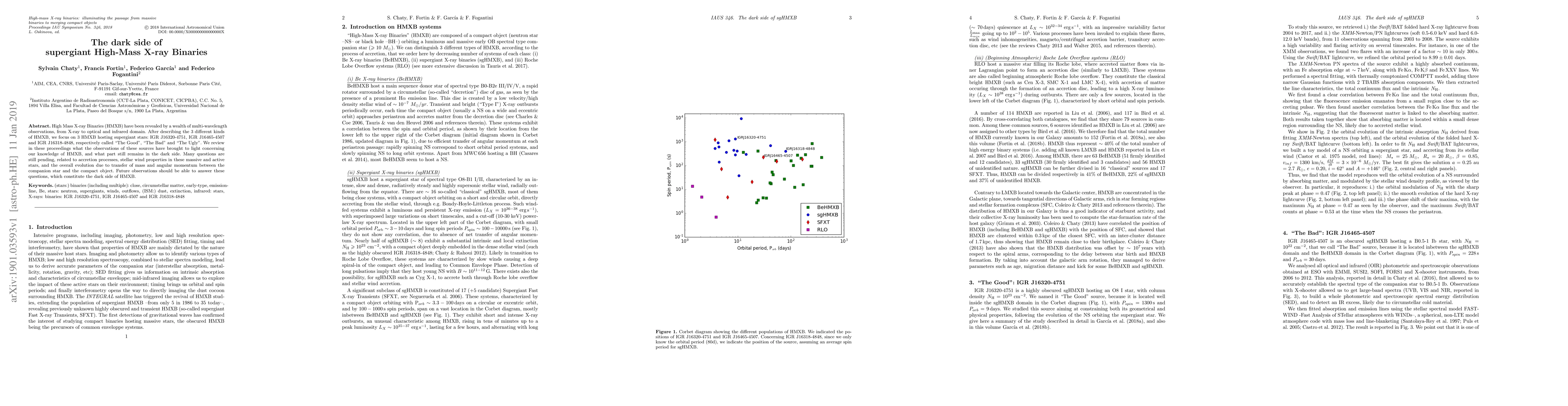 High Mass X-ray Binaries (HMXB) have been revealed by a wealth of multi-wavelength observations, from X-ray to optical and infrared domain. After describing the 3 different kinds of HMXB, we focus on 3 HMXB hosting supergiant stars: IGR J16320-4751, IGR J16465-4507 and IGR J16318-4848, respectively called "The Good", "The Bad" and "The Ugly". We review in these proceedings what the observations of these sources have brought to light concerning our knowledge of HMXB, and what part still remains in the dark side. Many questions are still pending, related to accretion processes, stellar wind properties in these massive and active stars, and the overall evolution due to transfer of mass and angular momentum between the companion star and the compact object. Future observations should be able to answer these questions, which constitute the dark side of HMXB.