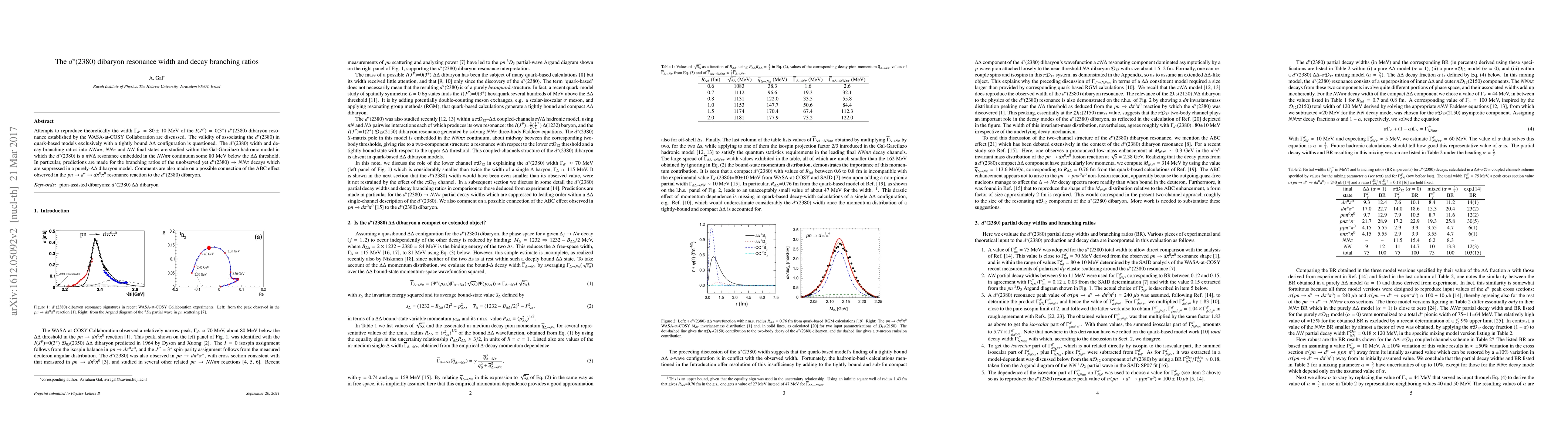 Attempts to reproduce theoretically the relatively small width, $\Gamma_{d^{\ast}}=80\pm 10$ MeV, of the $I(J^P)=0(3^+)$ $d^{\ast}$(2380) dibaryon resonance established by the WASA-at-COSY Collaboration are discussed. The validity of associating the $d^{\ast}$(2380) in quark-based models primarily with a tightly bound $\Delta\Delta$ configuration is questioned. The $d^{\ast}$(2380) width and decay branching ratios into $NN\pi\pi$, $NN\pi$ and $NN$ final states are studied within the Gal-Garcilazo hadronic model in which the $d^{\ast}$(2380) is a $\pi N\Delta$ resonance embedded in the $NN\pi\pi$ continuum some 80 MeV below the $\Delta\Delta$ threshold. In particular, predictions are made for the branching ratios of the unobserved yet $d^{\ast}(2380)\to NN\pi$ decays which are suppressed in a purely-$\Delta\Delta$ dibaryon model. Comments are also made on a possible connection of the ABC effect observed in the $pn\to d^{\ast}\to d\pi^0\pi^0$ resonance reaction to the $d^{\ast}$(2380) dibaryon.
