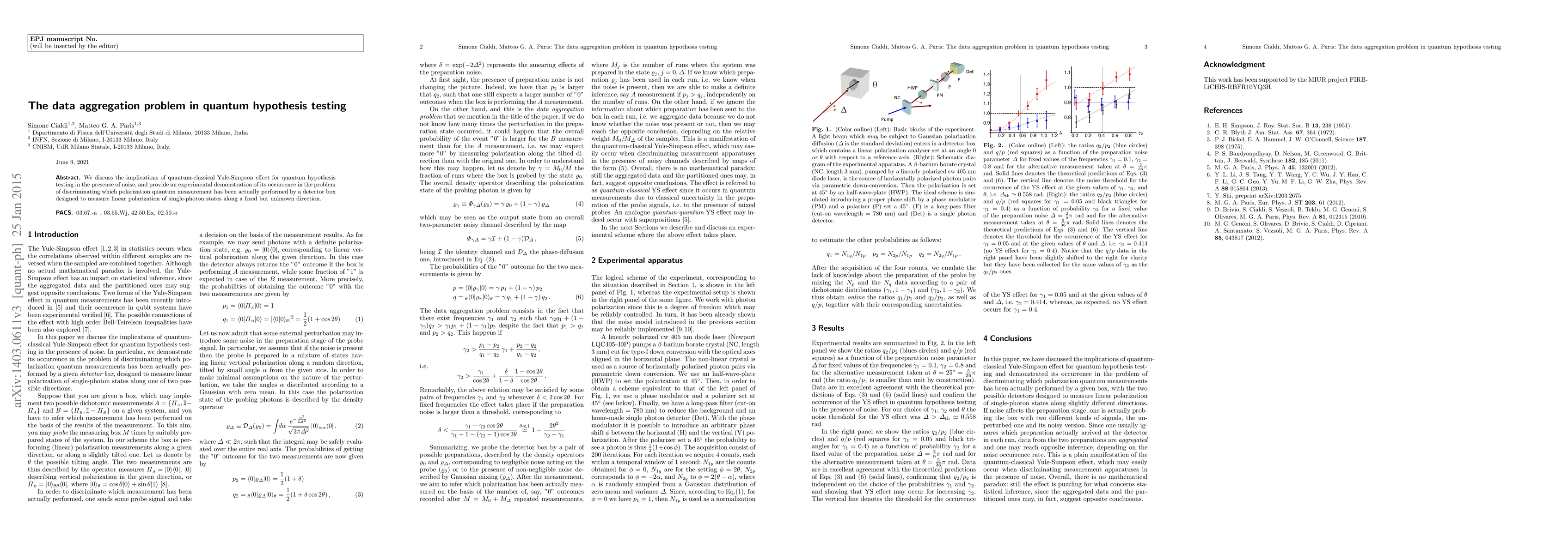 We discuss the implications of quantum-classical Yule-Simpson effect for quantum hypothesis testing in the presence of noise, and provide an experimental demonstration of its occurrence in the problem of discriminating which polarization quantum measurement has been actually performed by a detector box designed to measure linear polarization of single-photon states along a fixed but unknown direction.