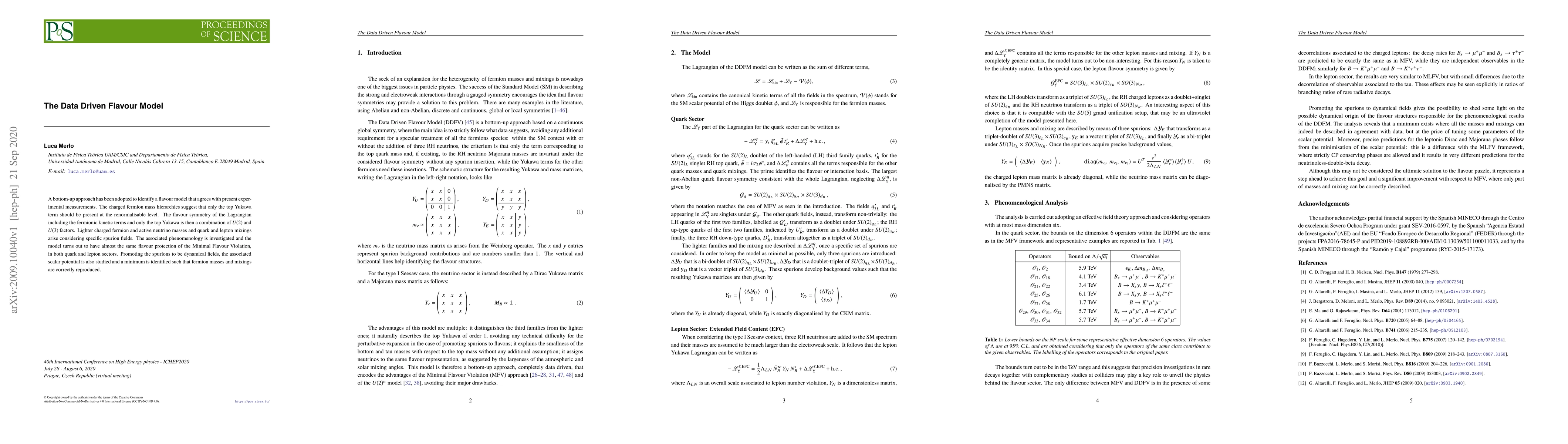 A bottom-up approach has been adopted to identify a flavour model that agrees with present experimental measurements. The charged fermion mass hierarchies suggest that only the top Yukawa term should be present at the renormalisable level. The flavour symmetry of the Lagrangian including the fermionic kinetic terms and only the top Yukawa is then a combination of U (2) and U(3) factors. Lighter charged fermion and active neutrino masses and quark and lepton mixings arise considering specific spurion fields. The associated phenomenology is investigated and the model turns out to have almost the same flavour protection of the Minimal Flavour Violation, in both quark and lepton sectors. Promoting the spurions to be dynamical fields, the associated scalar potential is also studied and a minimum is identified such that fermion masses and mixings are correctly reproduced.