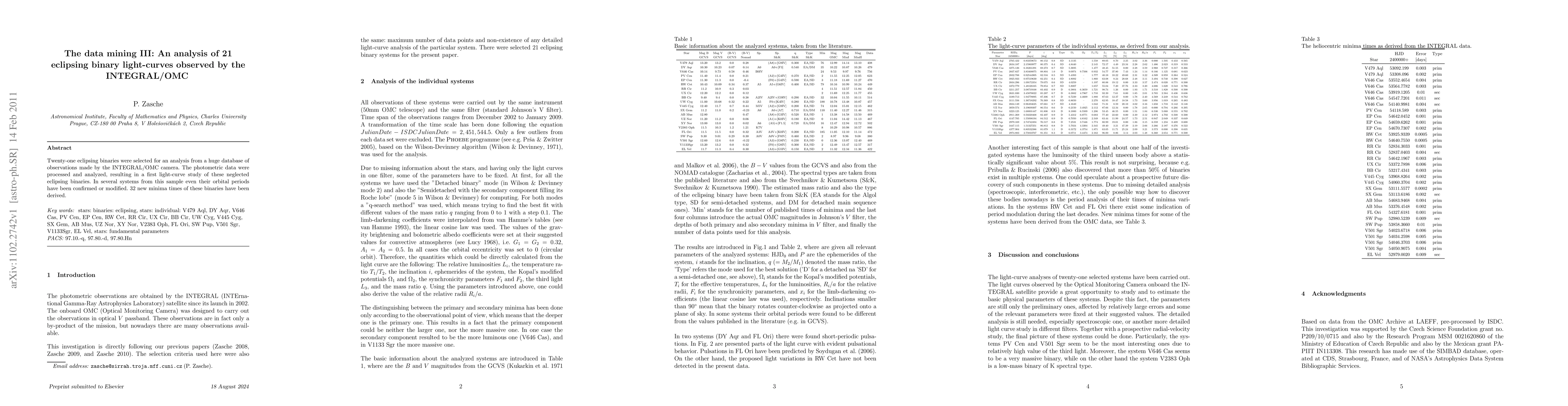 Twenty-one eclipsing binaries were selected for an analysis from a huge database of observations made by the INTEGRAL/OMC camera. The photometric data were processed and analyzed, resulting in a first light-curve study of these neglected eclipsing binaries. In several systems from this sample even their orbital periods have been confirmed or modified. Thirty-two new minima times of these binaries have been derived.