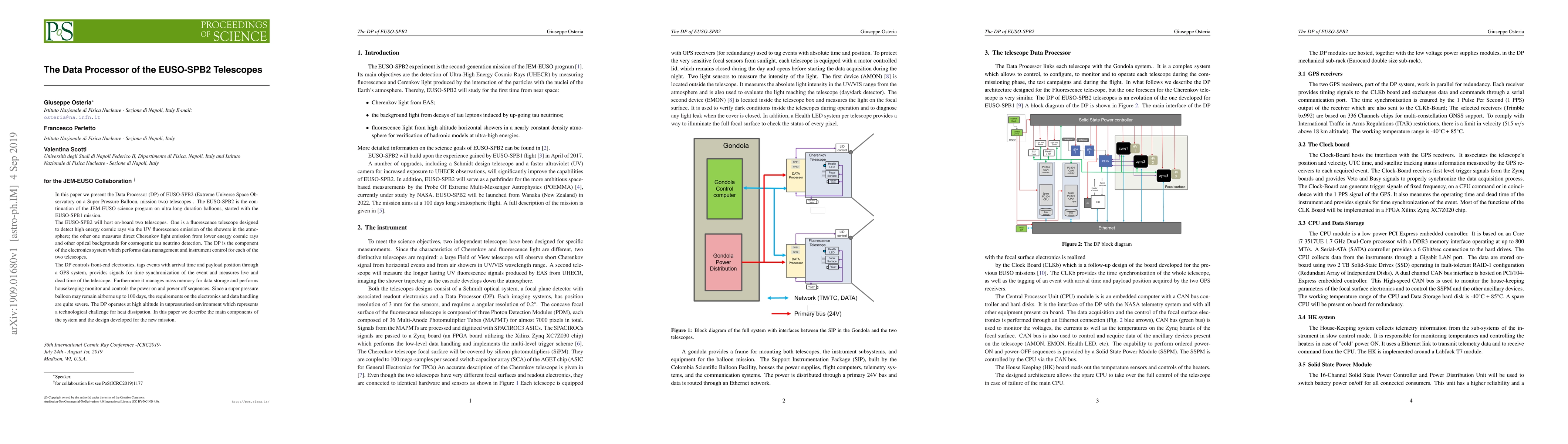 In this paper we present the Data Processor (DP) of EUSO-SPB2 (Extreme Universe Space Observatory on a Super Pressure Balloon, mission two) telescopes . The EUSO-SPB2 is the continuation of the JEM-EUSO science program on ultra-long duration balloons, started with the EUSO-SPB1 mission. The EUSO-SPB2 will host on-board two telescopes. One is a fluorescence telescope designed to detect high energy cosmic rays via the UV fluorescence emission of the showers in the atmosphere; the other one measures direct Cherenkov light emission from lower energy cosmic rays and other optical backgrounds for cosmogenic tau neutrino detection. The DP is the component of the electronics system which performs data management and instrument control for each of the two telescopes. The DP controls front-end electronics, tags events with arrival time and payload position through a GPS system, provides signals for time synchronization of the event and measures live and dead time of the telescope. Furthermore it manages mass memory for data storage and performs housekeeping monitor and controls the power on and power off sequences. Since a super pressure balloon may remain airborne up to 100 days, the requirements on the electronics and data handling are quite severe. The DP operates at high altitude in unpressurised environment which represents a technological challenge for heat dissipation. In this paper we describe the main components of the system and the design developed for the new mission.