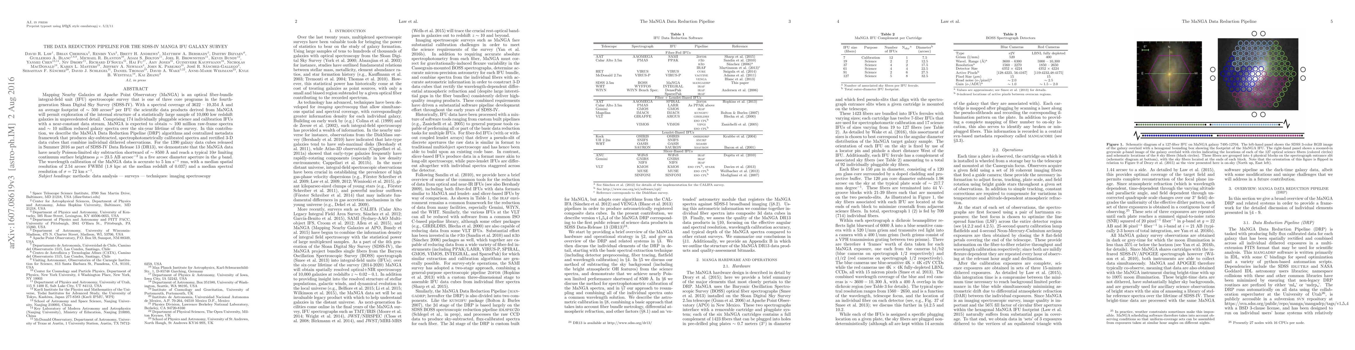 The MaNGA Data Reduction Pipeline (DRP) processes the vast amount of raw spectra from the MaNGA survey, producing high-quality, sky-subtracted, and spectrophotometrically calibrated 3-D data cubes. The DRP achieves nearly Poisson-limited sky subtraction and a median spatial resolution of 2.54 arcsec FWHM.