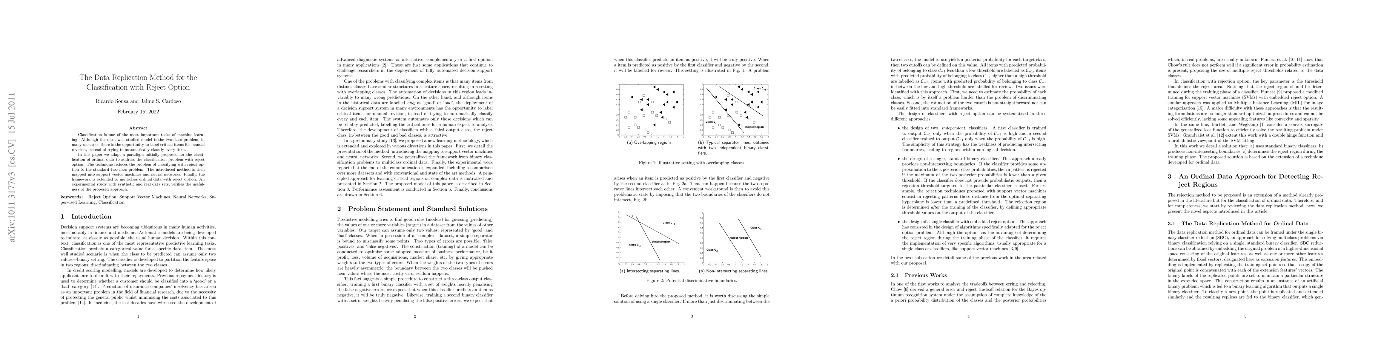 This paper proposes a data replication method to tackle classification problems with a reject option, adapting an ordinal classification paradigm to reduce it to a standard two-class problem. The method is implemented using support vector machines and neural networks, and is experimentally validated on both synthetic and real datasets.