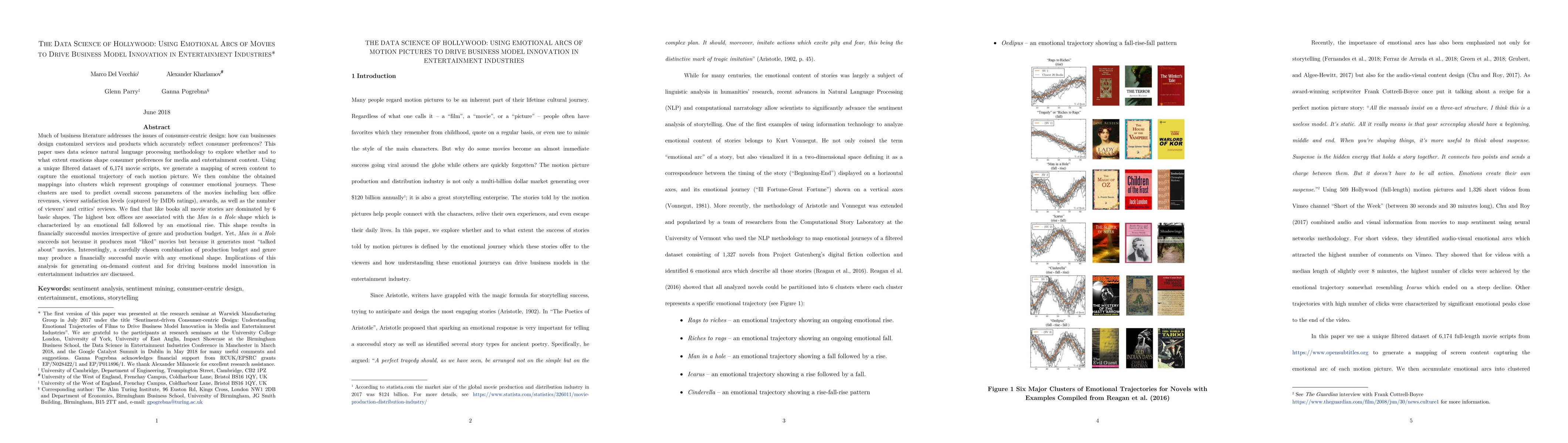Much of business literature addresses the issues of consumer-centric design: how can businesses design customized services and products which accurately reflect consumer preferences? This paper uses data science natural language processing methodology to explore whether and to what extent emotions shape consumer preferences for media and entertainment content. Using a unique filtered dataset of 6,174 movie scripts, we generate a mapping of screen content to capture the emotional trajectory of each motion picture. We then combine the obtained mappings into clusters which represent groupings of consumer emotional journeys. These clusters are used to predict overall success parameters of the movies including box office revenues, viewer satisfaction levels (captured by IMDb ratings), awards, as well as the number of viewers' and critics' reviews. We find that like books all movie stories are dominated by 6 basic shapes. The highest box offices are associated with the Man in a Hole shape which is characterized by an emotional fall followed by an emotional rise. This shape results in financially successful movies irrespective of genre and production budget. Yet, Man in a Hole succeeds not because it produces most "liked" movies but because it generates most "talked about" movies. Interestingly, a carefully chosen combination of production budget and genre may produce a financially successful movie with any emotional shape. Implications of this analysis for generating on-demand content and for driving business model innovation in entertainment industries are discussed.
