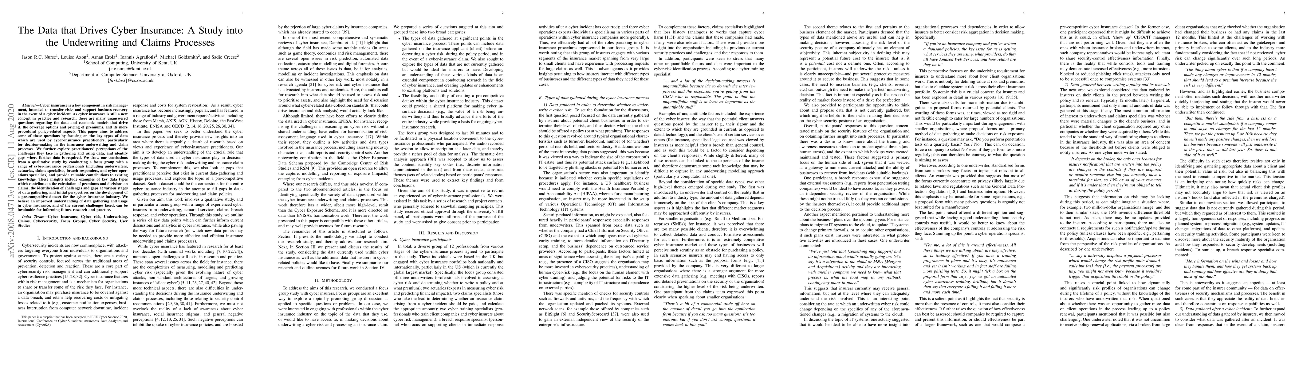 Cyber insurance is a key component in risk management, intended to transfer risks and support business recovery in the event of a cyber incident. As cyber insurance is still a new concept in practice and research, there are many unanswered questions regarding the data and economic models that drive it, the coverage options and pricing of premiums, and its more procedural policy-related aspects. This paper aims to address some of these questions by focusing on the key types of data which are used by cyber-insurance practitioners, particularly for decision-making in the insurance underwriting and claim processes. We further explore practitioners' perceptions of the challenges they face in gathering and using data, and identify gaps where further data is required. We draw our conclusions from a qualitative study by conducting a focus group with a range of cyber-insurance professionals (including underwriters, actuaries, claims specialists, breach responders, and cyber operations specialists) and provide valuable contributions to existing knowledge. These insights include examples of key data types which contribute to the calculation of premiums and decisions on claims, the identification of challenges and gaps at various stages of data gathering, and initial perspectives on the development of a pre-competitive dataset for the cyber insurance industry. We believe an improved understanding of data gathering and usage in cyber insurance, and of the current challenges faced, can be invaluable for informing future research and practice.