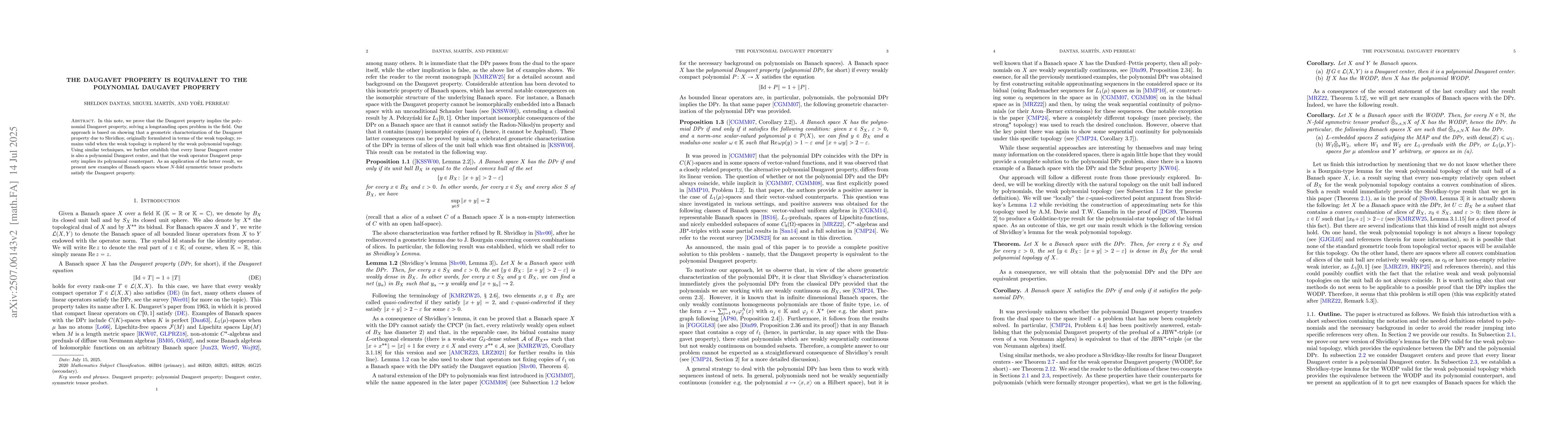 In this note, we prove that the Daugavet property implies the polynomial Daugavet property, solving a longstanding open problem in the field. Our approach is based on showing that a geometric characterization of the Daugavet property due to Shvidkoy, originally formulated in terms of the weak topology, remains valid when the weak topology is replaced by the weak polynomial topology. Using similar techniques, we further establish that every linear Daugavet center is also a polynomial Daugavet center, and that the weak operator Daugavet property implies its polynomial counterpart. As an application of the latter result, we present new examples of Banach spaces whose $N$-fold symmetric tensor products satisfy the Daugavet property.