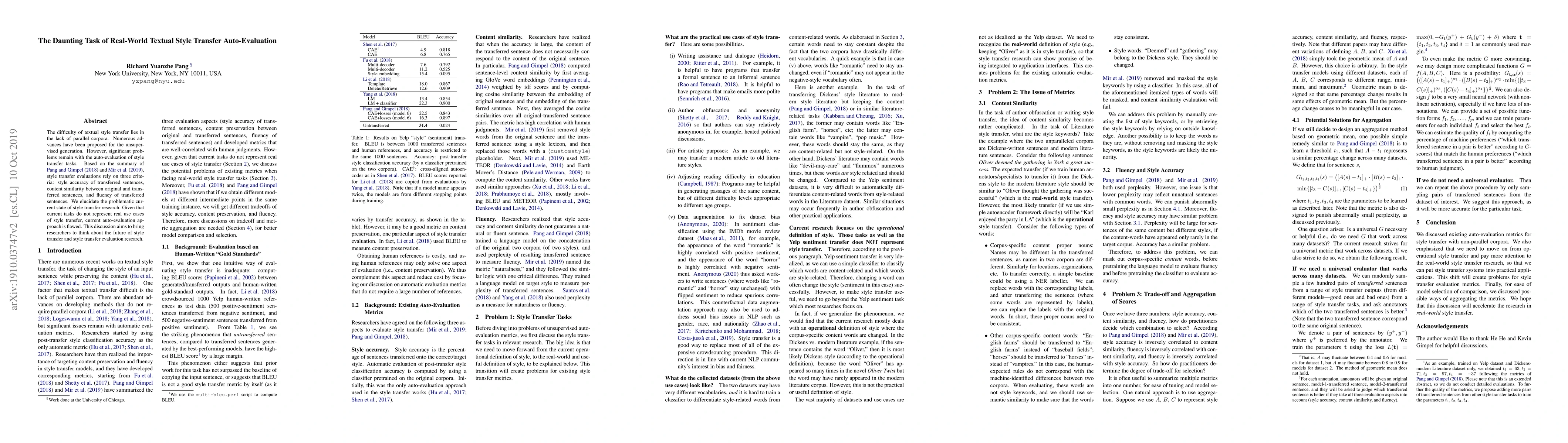 The difficulty of textual style transfer lies in the lack of parallel corpora. Numerous advances have been proposed for the unsupervised generation. However, significant problems remain with the auto-evaluation of style transfer tasks. Based on the summary of Pang and Gimpel (2018) and Mir et al. (2019), style transfer evaluations rely on three criteria: style accuracy of transferred sentences, content similarity between original and transferred sentences, and fluency of transferred sentences. We elucidate the problematic current state of style transfer research. Given that current tasks do not represent real use cases of style transfer, current auto-evaluation approach is flawed. This discussion aims to bring researchers to think about the future of style transfer and style transfer evaluation research.