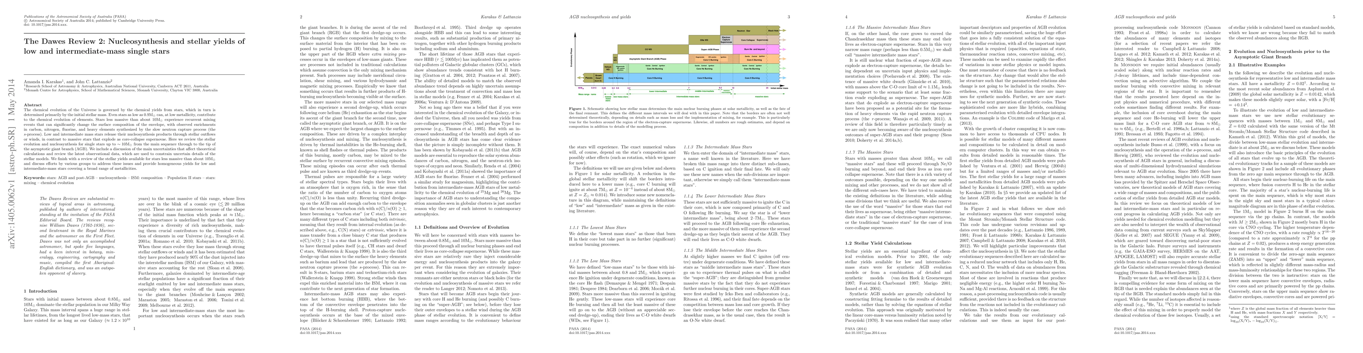 The chemical evolution of the Universe is governed by the chemical yields from stars, which in turn is determined primarily by the initial stellar mass. Even stars as low as 0.9Msun can, at low metallicity, contribute to the chemical evolution of elements. Stars less massive than about 10Msun experience recurrent mixing events that can significantly change the surface composition of the envelope, with observed enrichments in carbon, nitrogen, fluorine, and heavy elements synthesized by the slow neutron capture process (the s-process). Low and intermediate mass stars release their nucleosynthesis products through stellar outflows or winds, in contrast to massive stars that explode as core-collapse supernovae. Here we review the stellar evolution and nucleosynthesis for single stars up to ~10Msun from the main sequence through to the tip of the asymptotic giant branch (AGB). We include a discussion of the main uncertainties that affect theoretical calculations and review the latest observational data, which are used to constrain uncertain details of the stellar models. We finish with a review of the stellar yields available for stars less massive than about 10Msun and discuss efforts by various groups to address these issues and provide homogeneous yields for low and intermediate-mass stars covering a broad range of metallicities.