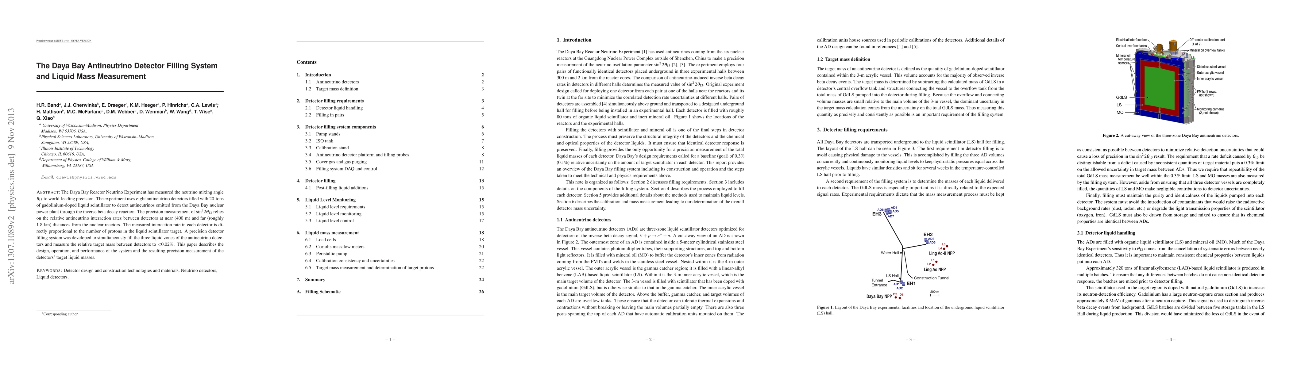 The Daya Bay Antineutrino Detector Filling System and Liquid Mass Measurement research paper details the development and performance of a precision filling system for the Daya Bay Reactor Neutrino Experiment. This system simultaneously fills the three liquid zones of antineutrino detectors and measures the relative target liquid masses with an accuracy of <0.02%.