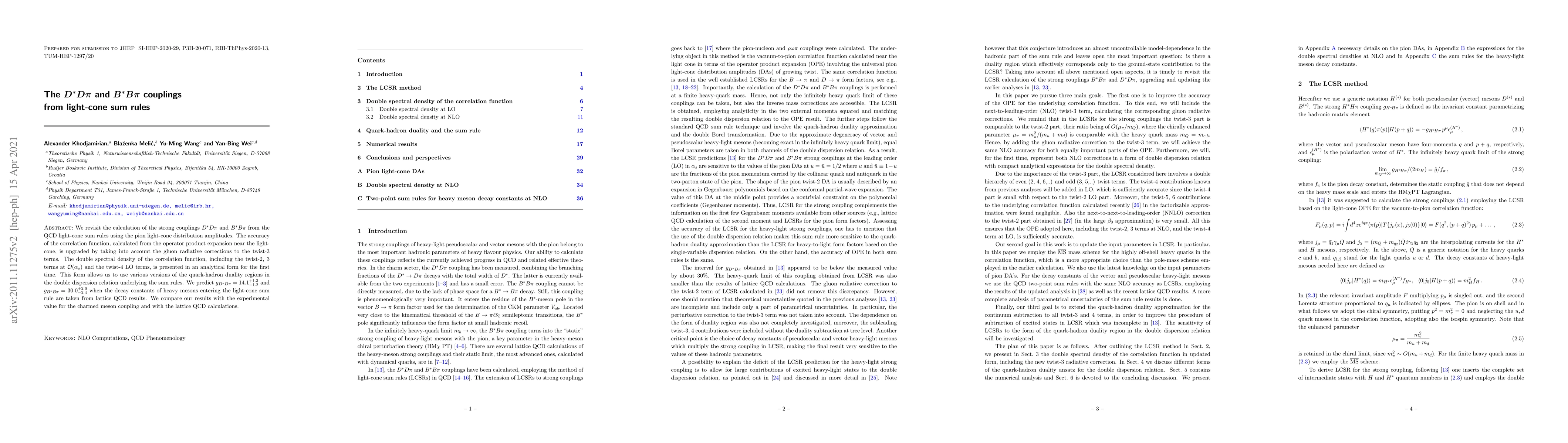 This paper calculates the $D^*D\pi$ and $B^*B\pi$ strong couplings from QCD light-cone sum rules, incorporating improved gluon radiative corrections and presenting the double spectral density analytically. The predicted values are $g_{D^*D\pi}=14.1^{+1.3}_{-1.2}$ and $g_{B^*B\pi}=30.0^{+2.6}_{-2.4}$, compared with experimental and lattice QCD results.