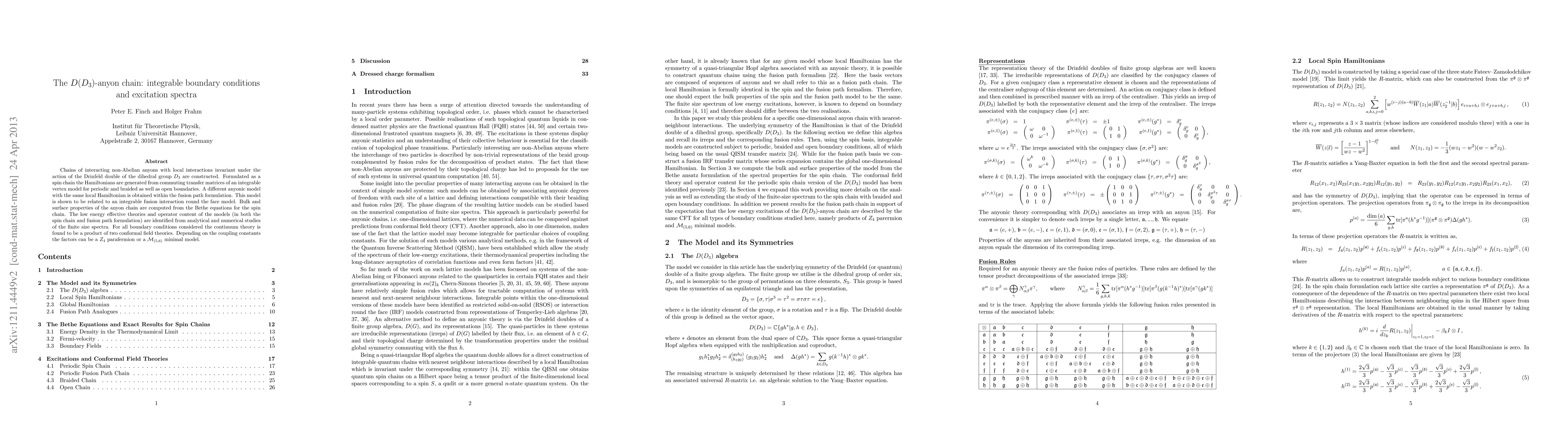 This paper constructs chains of interacting non-Abelian anyons under the Drinfeld double of the dihedral group $D_3$, formulating them as integrable spin chains with various boundary conditions. The study reveals the low-energy effective theories and operator content through Bethe equations and identifies the continuum theory as a product of two conformal field theories.