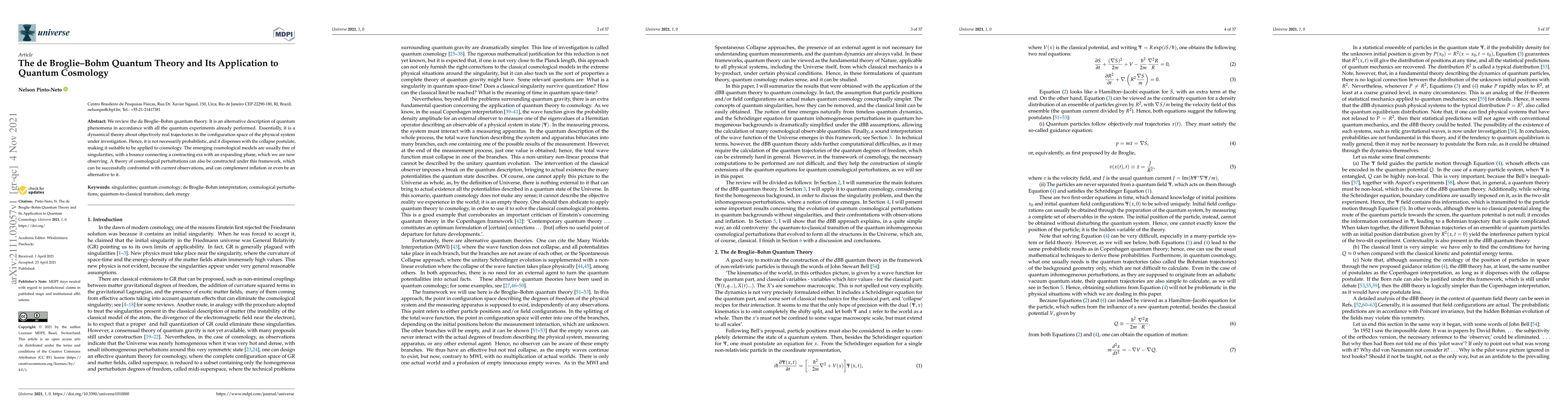 The de Broglie-Bohm quantum theory offers an alternative, deterministic description of quantum phenomena, suitable for cosmology by avoiding singularities and introducing a bounce between contraction and expansion phases. It also provides a framework for cosmological perturbations that can compete with or replace inflation models.