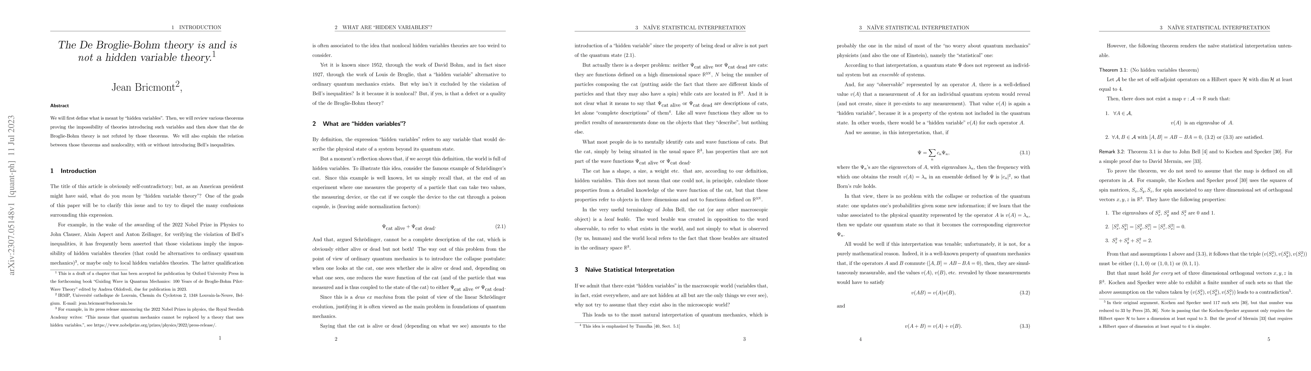 Summary: This paper clarifies the concept of "hidden variables" and demonstrates that the de Broglie-Bohm theory, despite being nonlocal, does not fall under the impossibility theorems that exclude such variables, thus distinguishing it from traditional hidden variable theories.