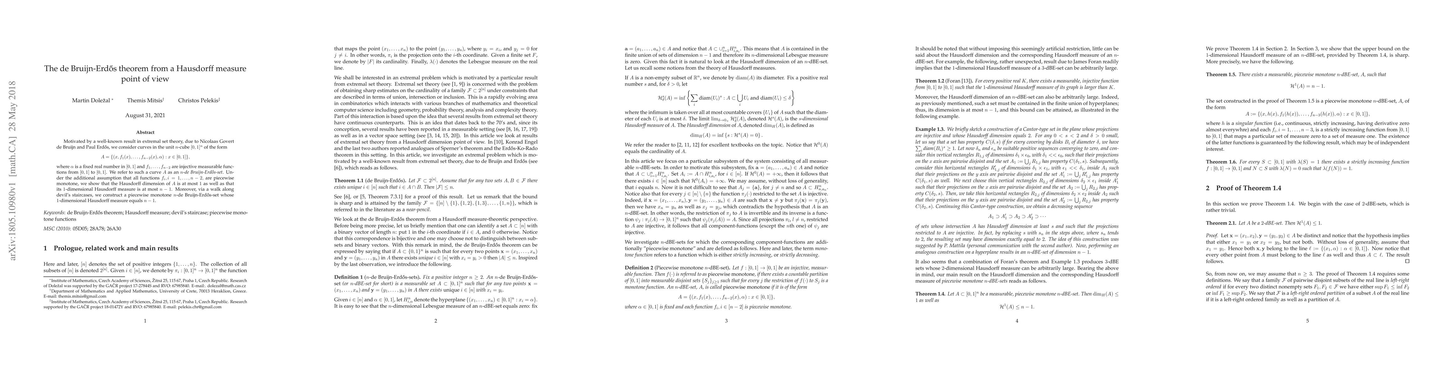 Motivated by a well-known result in extremal set theory, due to Nicolaas Govert de Bruijn and Paul Erd\H{o}s, we consider curves in the unit $n$-cube $[0,1]^n$ of the form \[ A=\{(x,f_1(x),\ldots,f_{n-2}(x),\alpha): x\in [0,1]\}, \] where $\alpha$ is a fixed real number in $[0,1]$ and $f_1,\ldots,f_{n-2}$ are injective measurable functions from $[0,1]$ to $[0,1]$. We refer to such a curve $A$ as an $n$-\emph{de~Bruijn-Erd\H{o}s-set}. Under the additional assumption that all functions $f_i,i=1,\ldots,n-2,$ are piecewise monotone, we show that the Hausdorff dimension of $A$ is at most $1$ as well as that its $1$-dimensional Hausdorff measure is at most $n-1$. Moreover, via a walk along devil's staircases, we construct a piecewise monotone $n$-de~Bruijn-Erd\H{o}s-set whose $1$-dimensional Hausdorff measure equals $n-1$.