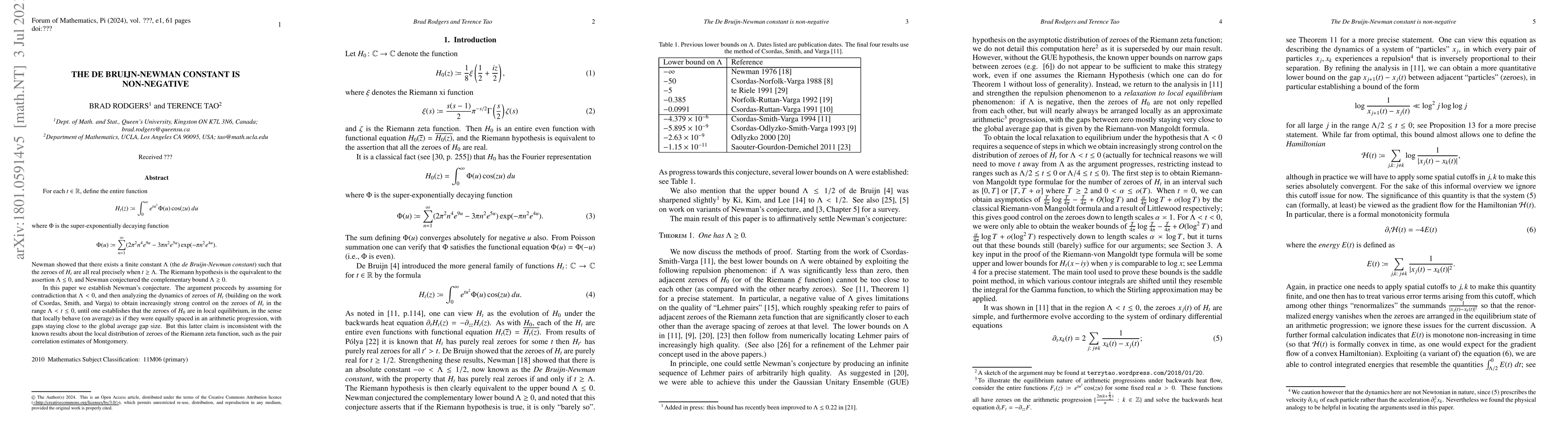 For each $t \in {\bf R}$, define the entire function $$ H_t(x) := \int_0^\infty e^{tu^2} \Phi(u) \cos(xu)\ du$$ where $\Phi$ is the super-exponentially decaying function $$ \Phi(u) := \sum_{n=1}^\infty (2\pi^2 n^4 e^{9u} - 3\pi n^2 e^{5u} ) \exp(-\pi n^2 e^{4u} ).$$ Newman showed that there exists a finite constant $\Lambda$ (the \emph{de Bruijn-Newman constant}) such that the zeroes of $H_t$ are all real precisely when $t \geq \Lambda$. The Riemann hypothesis is the equivalent to the assertion $\Lambda \leq 0$, and Newman conjectured the complementary bound $\Lambda \geq 0$. In this paper we establish Newman's conjecture. The argument proceeds by assuming for contradiction that $\Lambda < 0$, and then analyzing the dynamics of zeroes of $H_t$ (building on the work of Csordas, Smith, and Varga) to obtain increasingly strong control on the zeroes of $H_t$ in the range $\Lambda < t \leq 0$, until one establishes that the zeroes of $H_0$ are in local equilibrium, in the sense that locally behave (on average) as if they were equally spaced in an arithmetic progression, with gaps staying close to the global average gap size. But this latter claim is inconsistent with the known results about the local distribution of zeroes of the Riemann zeta function, such as the pair correlation estimates of Montgomery.