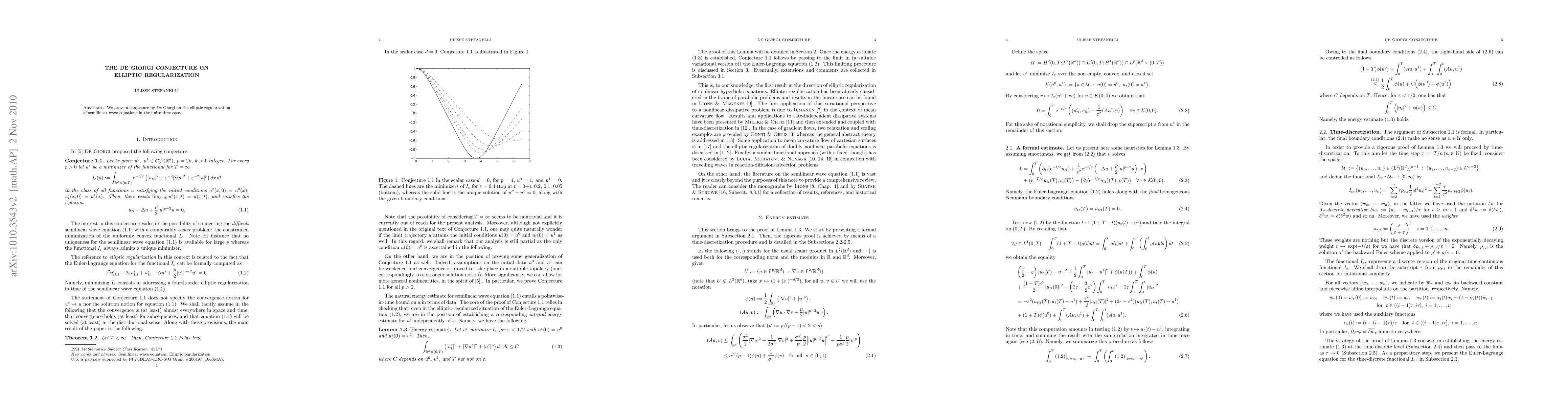 We prove a conjecture by De Giorgi on the elliptic regularization of semilinear wave equations in the finite-time case.