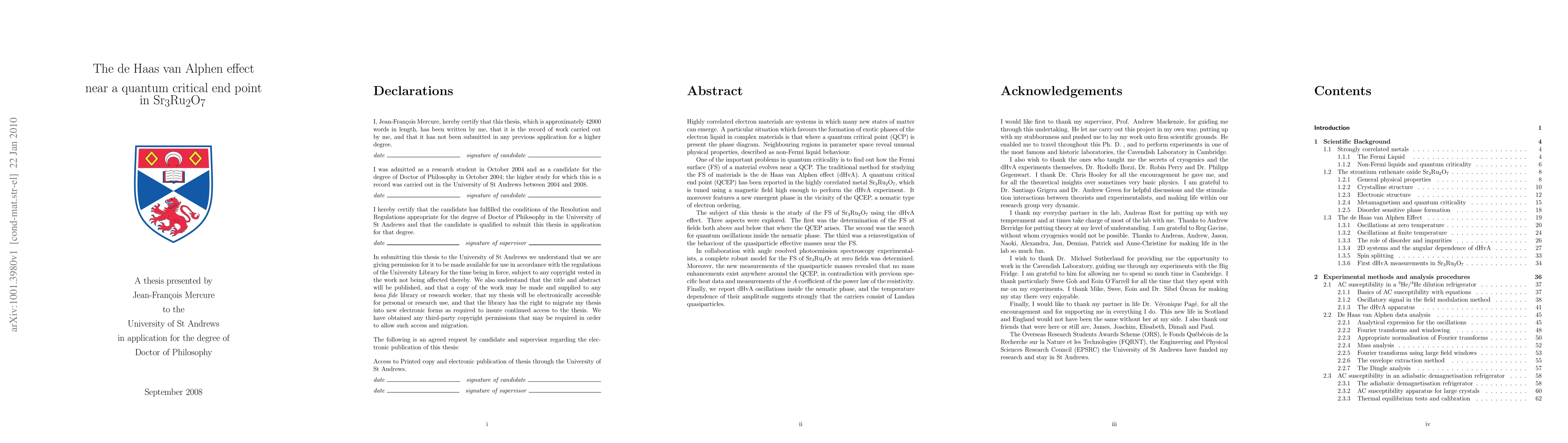 Highly correlated electron materials are systems in which many new states of matter can emerge. A particular situation which favours the formation of exotic phases of the electron liquid in complex materials is that where a quantum critical point (QCP) is present the phase diagram. Neighbouring regions in parameter space reveal unusual physical properties, described as non-Fermi liquid behaviour. One of the important problems in quantum criticality is to find out how the Fermi surface (FS) of a material evolves near a QCP. The traditional method for studying the FS of materials is the de Haas van Alphen effect (dHvA). A quantum critical end point (QCEP) has been reported in the highly correlated metal Sr3Ru2O7, which is tuned using a magnetic field high enough to perform the dHvA experiment. It moreover features a new emergent phase in the vicinity of the QCEP, a nematic type of electron ordering. The subject of this thesis is the study of the FS of Sr3Ru2O7 using the dHvA effect. Three aspects were explored. The first was the determination of the FS at fields both above and below that where the QCEP arises. The second was the search for quantum oscillations inside the nematic phase. The third was a reinvestigation of the behaviour of the quasiparticle effective masses near the FS. A complete robust model for the FS of Sr3Ru2O7 at zero fields was determined. Moreover, the new measurements of the quasiparticle masses revealed that no mass enhancements exist anywhere around the QCEP. Finally, we report dHvA oscillations inside the nematic phase, which suggests that the carriers consist of Landau quasiparticles.
