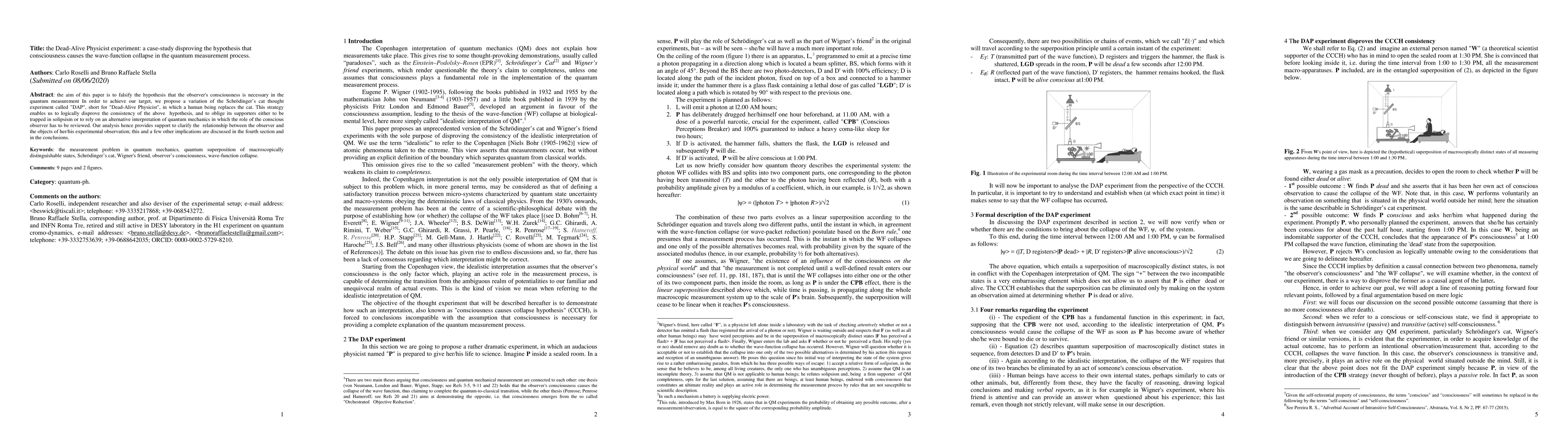 This paper aims to falsify the hypothesis that the observer's consciousness is necessary for quantum measurement. To achieve our target, we propose a variation of the Schroedinger's cat thought experiment called "DAP", short for "Dead-Alive Physicist", in which a human being replaces the cat. This strategy enables us to logically disprove the consistency of the above hypothesis and to oblige its supporters either to be trapped in solipsism or to rely on an alternative interpretation of quantum mechanics in which the role of the conscious observer has to be reviewed. Our analysis hence provides support to clarify the relationship between the observer the objects of her/his experimental observation; this and a few other implications are discussed in the fourth section and in the conclusions.