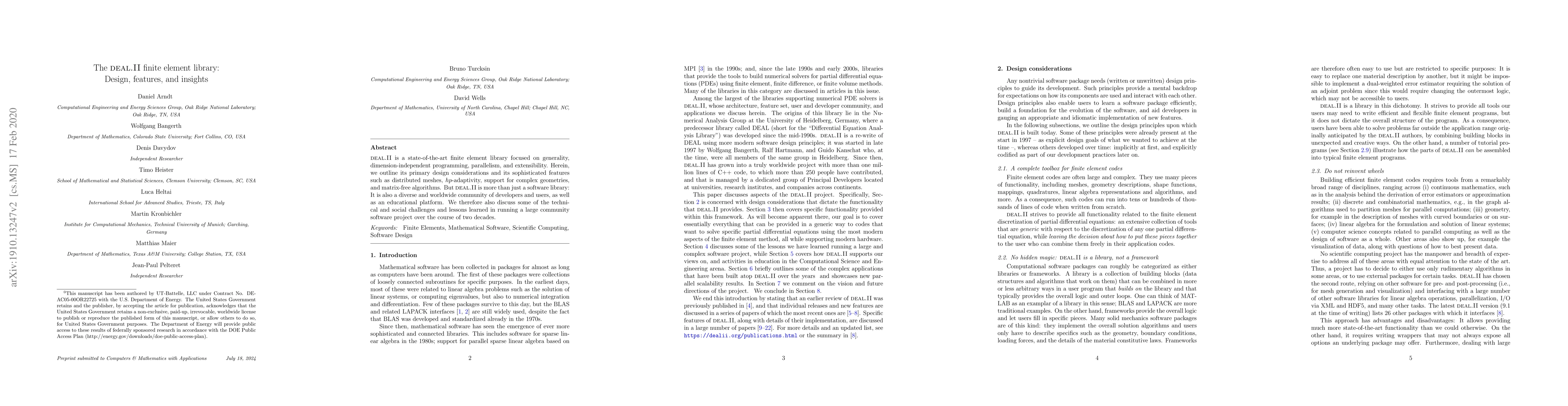 The deal.II finite element library emphasizes generality, parallelism, and extensibility, featuring distributed meshes, $hp$-adaptivity, and matrix-free algorithms. It also highlights the challenges and insights from its two-decade-long community-driven development.
