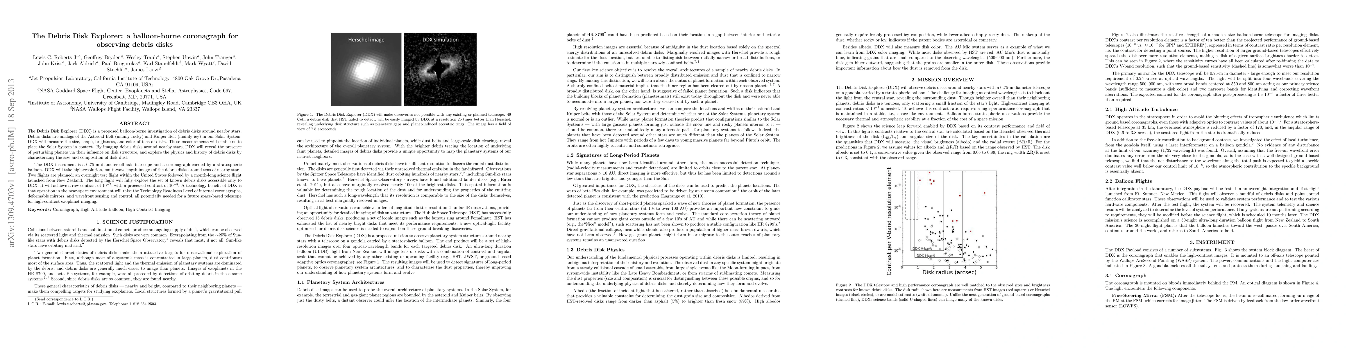 The Debris Disk Explorer (DDX) is a proposed balloon-borne coronagraph designed to observe and characterize debris disks around nearby stars, aiming to reveal the presence of perturbing planets and understand the physics and history of these disks. The DDX instrument will take high-resolution, multi-wavelength images, potentially advancing technologies for future space-based telescopes.