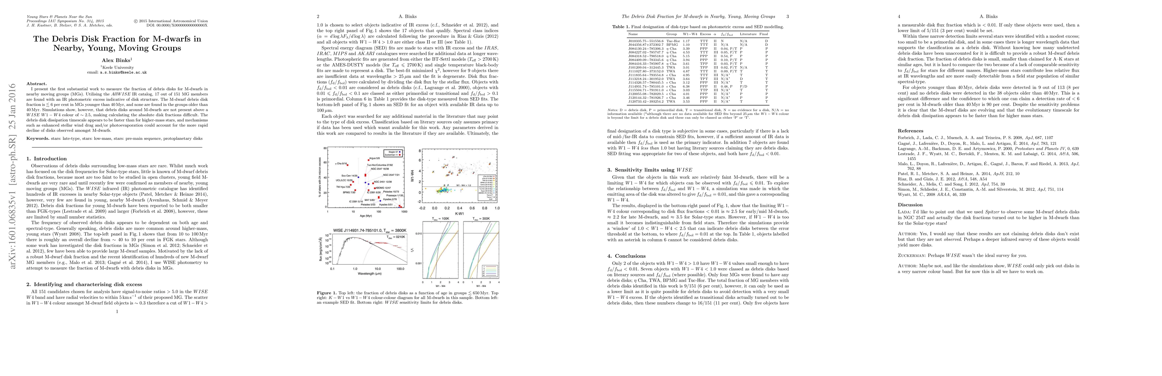 I present the first substantial work to measure the fraction of debris disks for M-dwarfs in nearby moving groups (MGs). Utilising the $AllWISE$ IR catalog, 17 out of 151 MG members are found with an IR photometric excess indicative of disk structure. The M-dwarf debris disk fraction is $\lesssim 6$ per cent in MGs younger than 40\,Myr, and none are found in the groups older than 40\,Myr. Simulations show, however, that debris disks around M-dwarfs are not present above a $WISE$ $W1-W4$ colour of $\sim 2.5$, making calculating the absolute disk fractions difficult. The debris disk dissipation timescale appears to be faster than for higher-mass stars, and mechanisms such as enhanced stellar wind drag and/or photoevaporation could account for the more rapid decline of disks observed amongst M-dwarfs.
