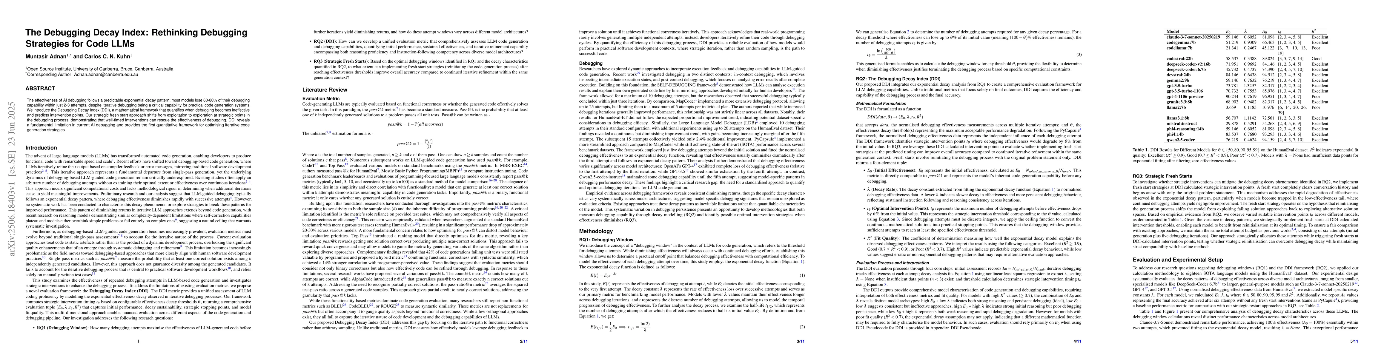 The research introduces the Debugging Decay Index (DDI) to quantify the decline in AI debugging effectiveness, showing a 60-80% loss after 2-3 attempts. It proposes a fresh start strategy, timing interventions to maintain debugging efficacy, addressing a key limitation in AI debugging and offering a framework for optimizing code generation systems.