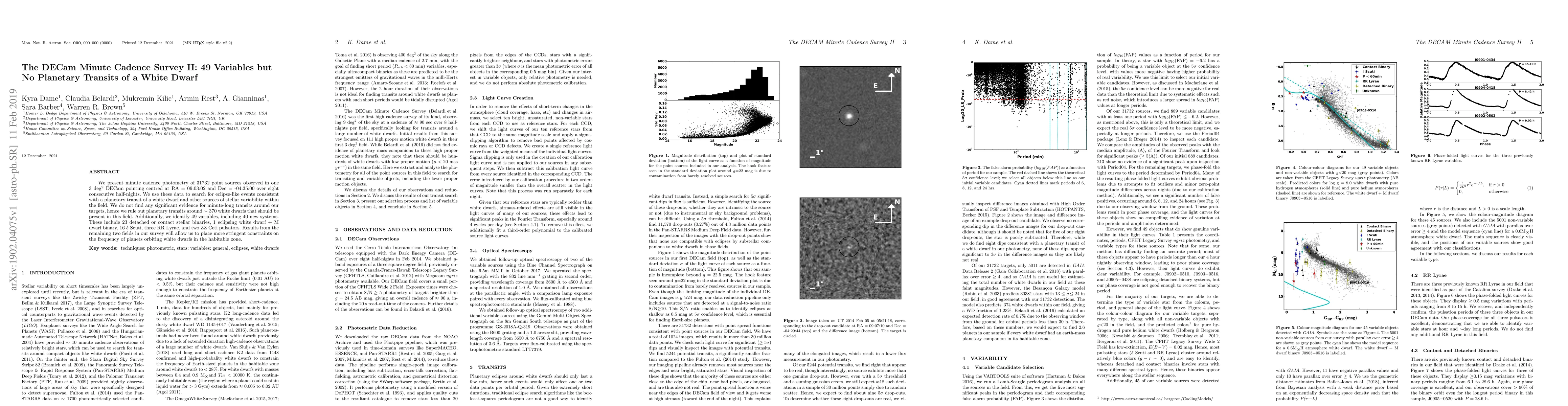 We present minute cadence photometry of 31732 point sources observed in one 3 $deg^{2}$ DECam pointing centred at RA = 09:03:02 and Dec = -04:35:00 over eight consecutive half-nights. We use these data to search for eclipse-like events consistent with a planetary transit of a white dwarf and other sources of stellar variability within the field. We do not find any significant evidence for minute-long transits around our targets, hence we rule out planetary transits around ~370 white dwarfs that should be present in this field. Additionally, we identify 49 variables, including 40 new systems. These include 23 detached or contact stellar binaries, 1 eclipsing white dwarf + M dwarf binary, 16 $\delta$ Scuti, three RR Lyrae, and two ZZ Ceti pulsators. Results from the remaining two fields in our survey will allow us to place more stringent constraints on the frequency of planets orbiting white dwarfs in the habitable zone.