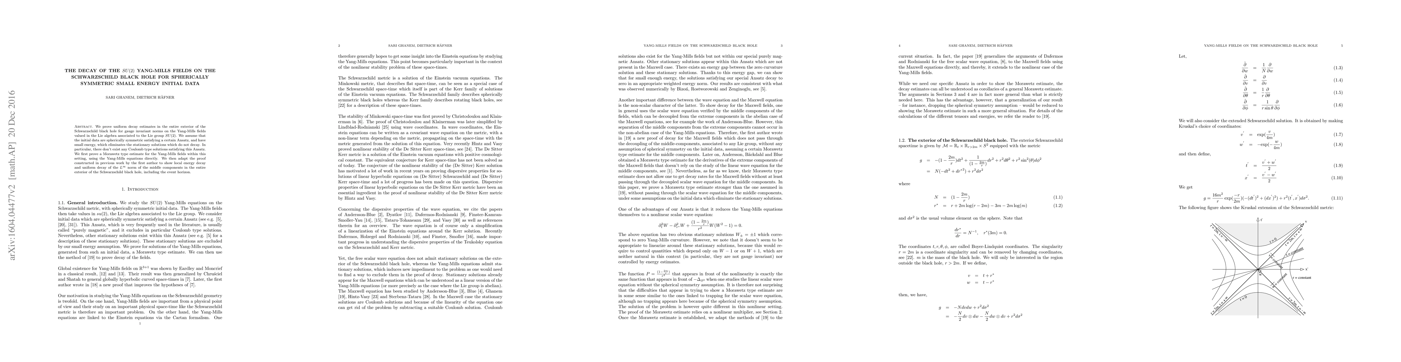 We prove uniform decay estimates in the entire exterior of the Schwarzschild black hole for gauge invariant norms on the Yang-Mills fields valued in the Lie algebra associated to the Lie group $SU(2)$. We assume that the initial data are spherically symmetric satisfying a certain Ansatz, and have small energy, which eliminates the stationary solutions which do not decay. In particular, there don't exist any Coulomb type solutions satisfying this Ansatz. We first prove a Morawetz type estimate for the Yang-Mills fields within this setting, using the Yang-Mills equations directly. We then adapt the proof constructed in previous work by the first author to show local energy decay and uniform decay of the $L^{\infty}$ norm of the middle components in the entire exterior of the Schwarzschild black hole, including the event horizon.