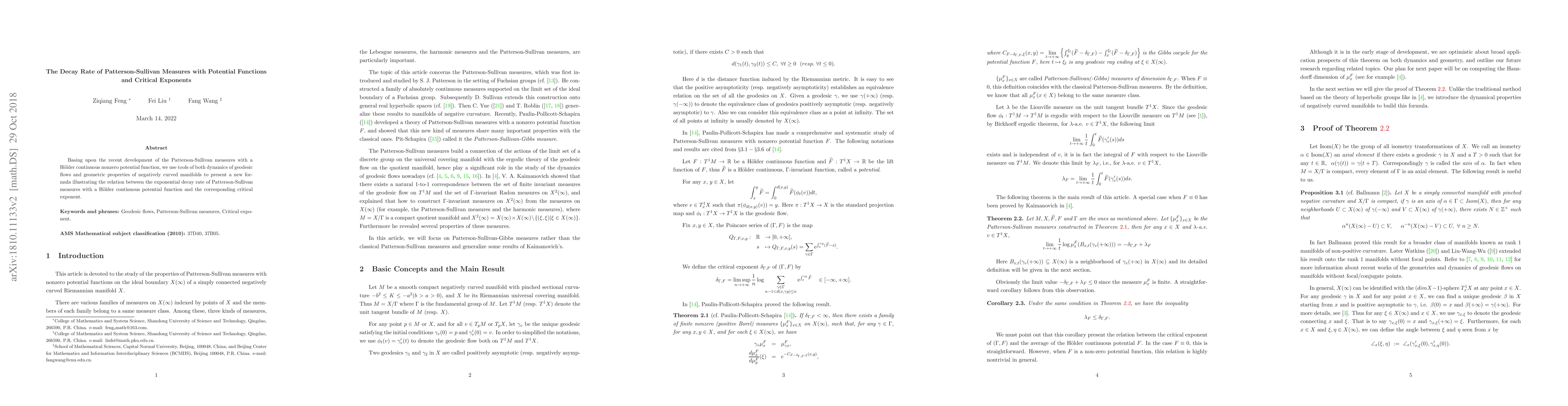 Summary: This paper develops a new formula linking the decay rate of Patterson-Sullivan measures with H\"older continuous potential functions to their corresponding critical exponents, utilizing dynamics of geodesic flows and geometric properties of negatively curved manifolds.
