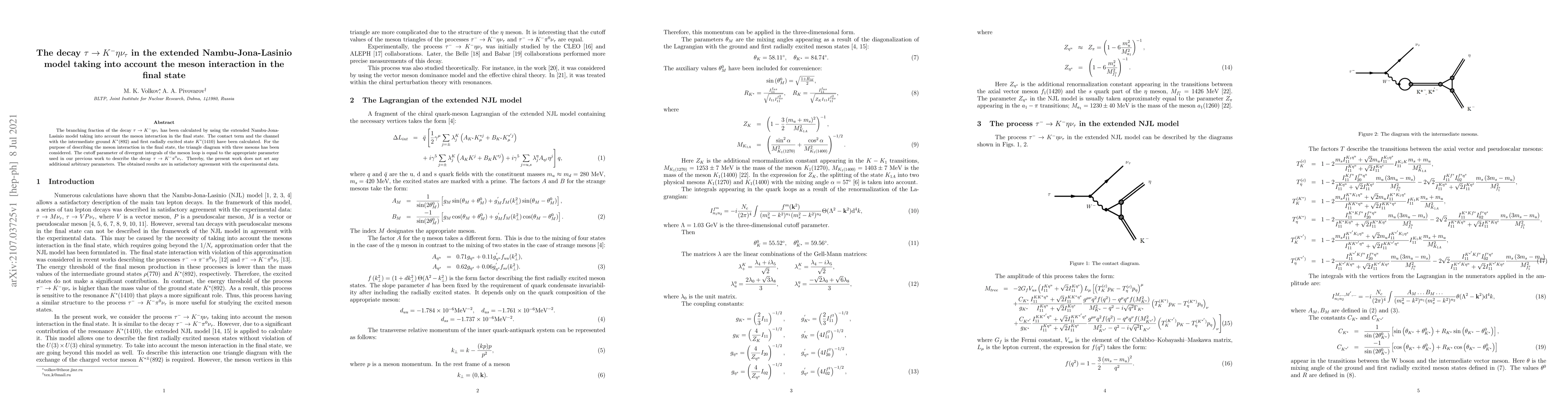 This paper calculates the branching fraction of the decay $\tau \to K^{-} \eta \nu_{\tau}$ using the extended Nambu-Jona-Lasinio model, considering meson interactions in the final state, and finds the results agree well with experimental data.