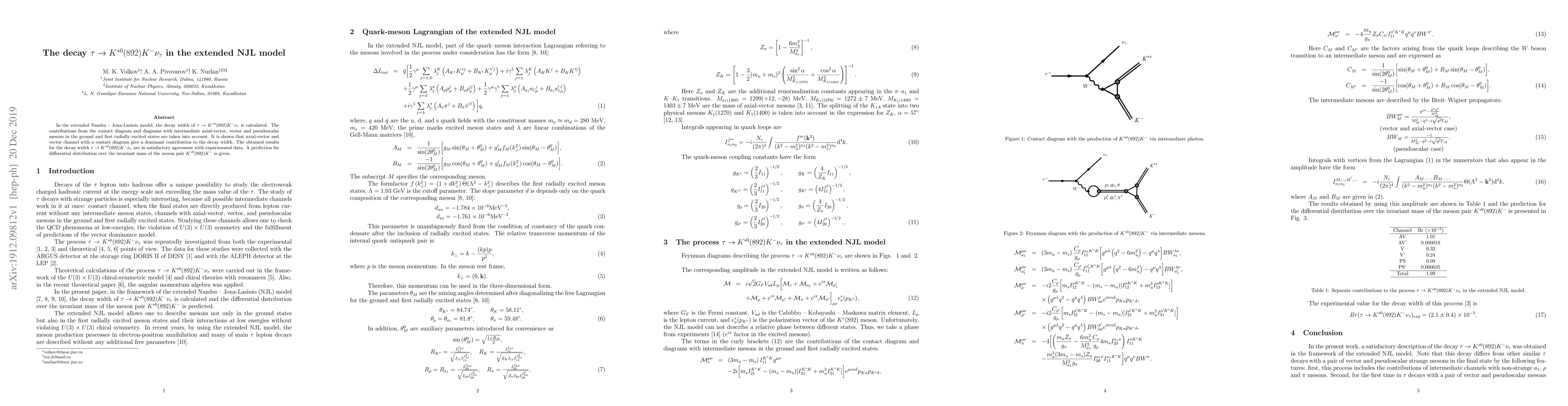 The extended Nambu--Jona-Lasinio model calculates the decay width for $\tau \to K^{*0}(892) K^- \nu_{\tau}$, showing that axial-vector and vector channels with contact diagrams dominate. The results align well with experimental data and provide a prediction for the differential distribution over the invariant mass of the meson pair.